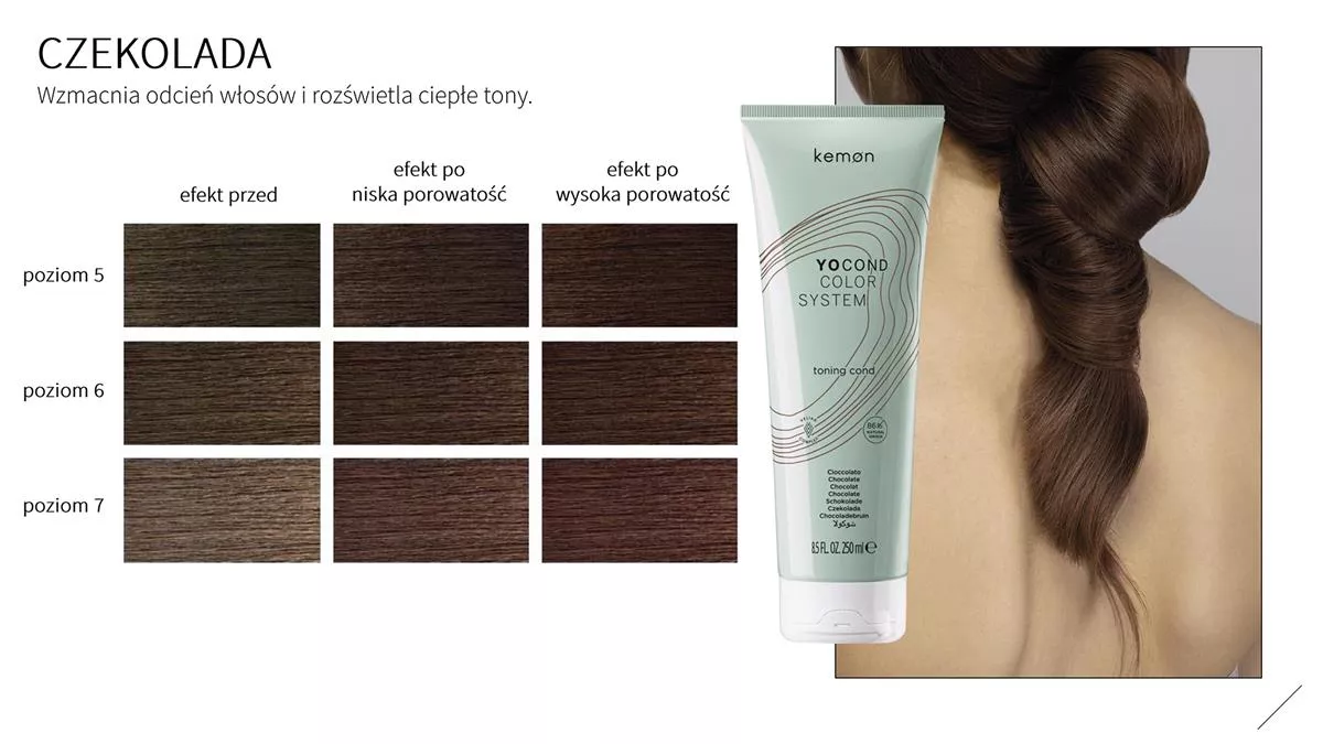 Odkryj moc koloryzacji i pielęgnacji w jednym produkcie dzięki odżywce koloryzującej Kemon Yo Cond w odcieniu czekolady. Ta wyjątkowa odżywka nie tylko odświeża i przedłuża trwałość koloru włosów między farbowaniami, ale również dba o ich kondycję, zapewniając miękkość, blask i głębię koloru.