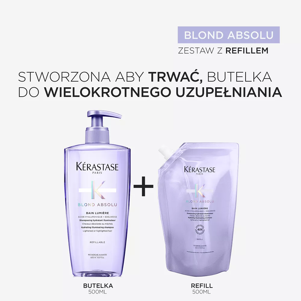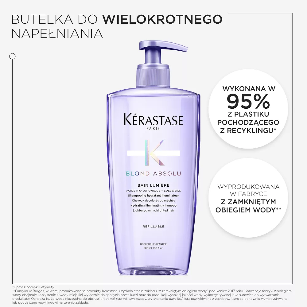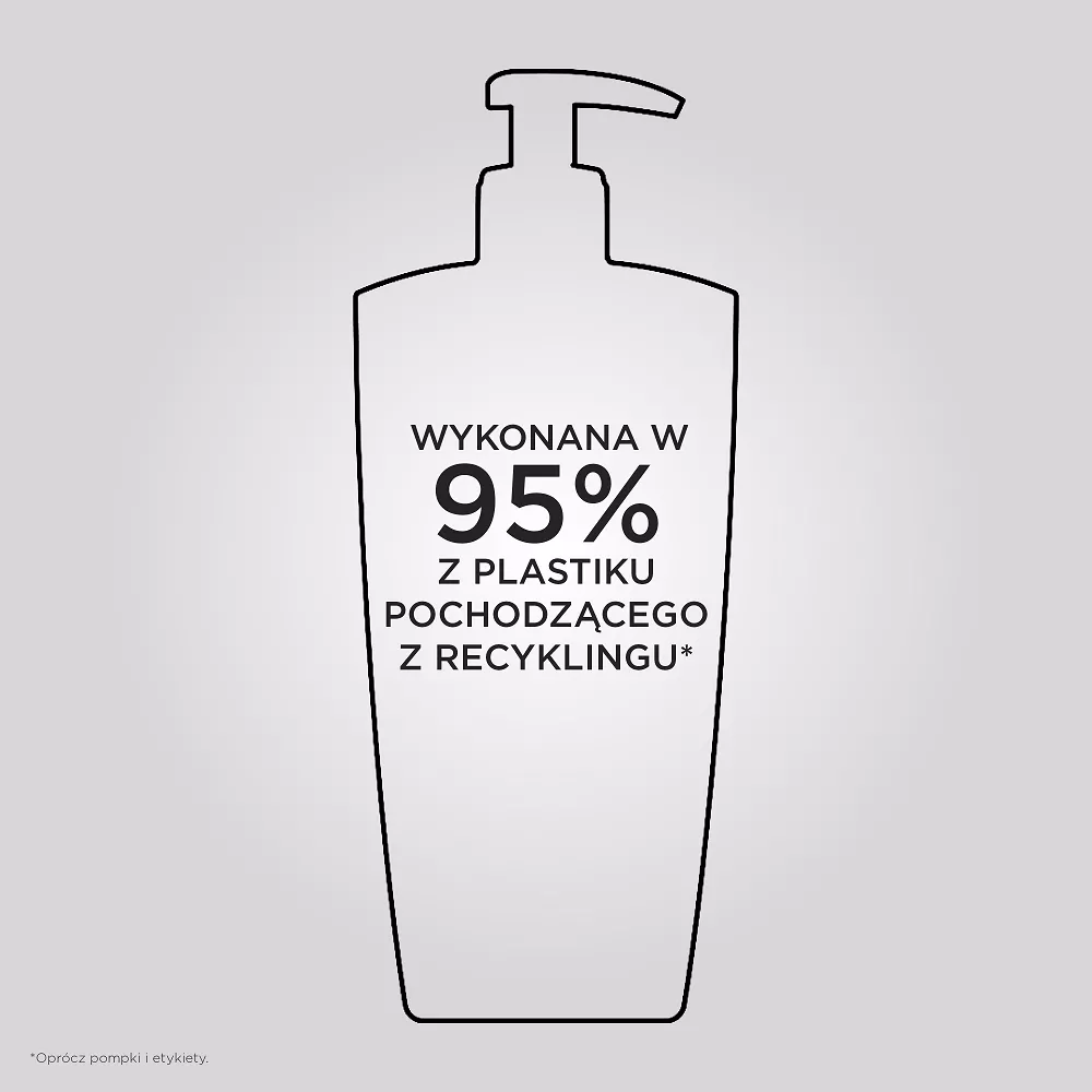 Butelka szamponu o pojemności 500ml do ponownego uzupełniania jest wykonana w 95% z plastiku pochodzącego z recyklingu* i wyprodukowana w fabryce ""z zamkniętym obiegiem wody”**, która osiągnęła 100% energii odnawialnej*** oraz z możliwością ponownego uzupełnienia wkładem uzupełniającym pozwalającym na zredukowanie zużycia plastiku o 82%****.