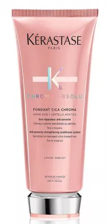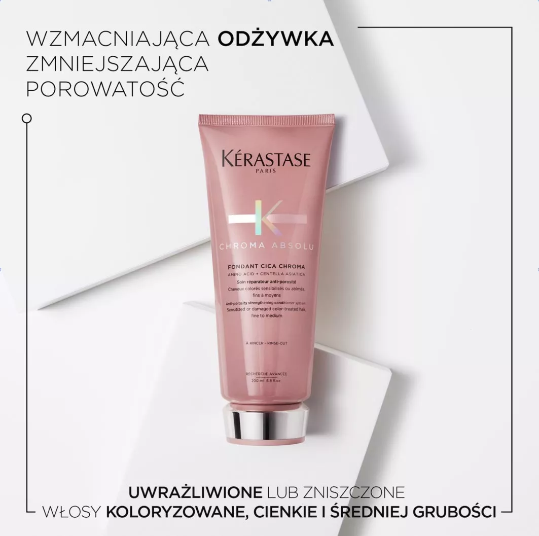 Wzmacniająca odżywka do włosów koloryzowanych Kerastase Chroma Absolu to bladoróżowy krem o lekkiej formule, który wnika do wnętrza włosów i tam nawilża, wzmacnia oraz wypełnia porowatość. Dzięki temu włosy są zdrowe, pięknie wyglądają i zachwycają intensywnym kolorem na długo. Odżywka zapewnia włosom ochronę przed twardą wodą, która może powodować wypłukiwanie koloru.