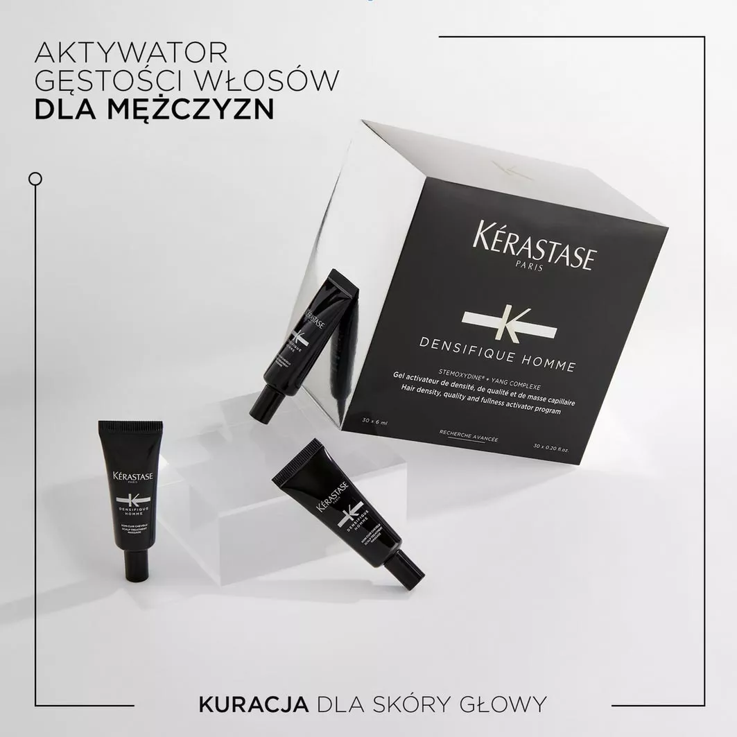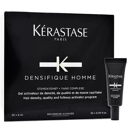 Kuracja kreująca gęstość włosów Kerastase Densifique Homme opiera swoje działanie na technologii Molekuły Stemoxydine. Działa ona już na poziomie cebulki włosa. Pomaga to eliminować problem nadmiaru tlenu w środowisku komórek macierzystych. W efekcie wybudza uśpione cebulki i stymuluje wzrost włosów. Ponadto w składzie znajdują się również polimery teksturyzujące, które mają silne właściwości kosmetyczne. Dzięki temu włosy są widocznie pogrubione. Natomniast Yang Complexe zwiększa grubość włosa oraz przyczynia się do powstania nawet 3300 nowych, grubszych i mocniejszych włosów.