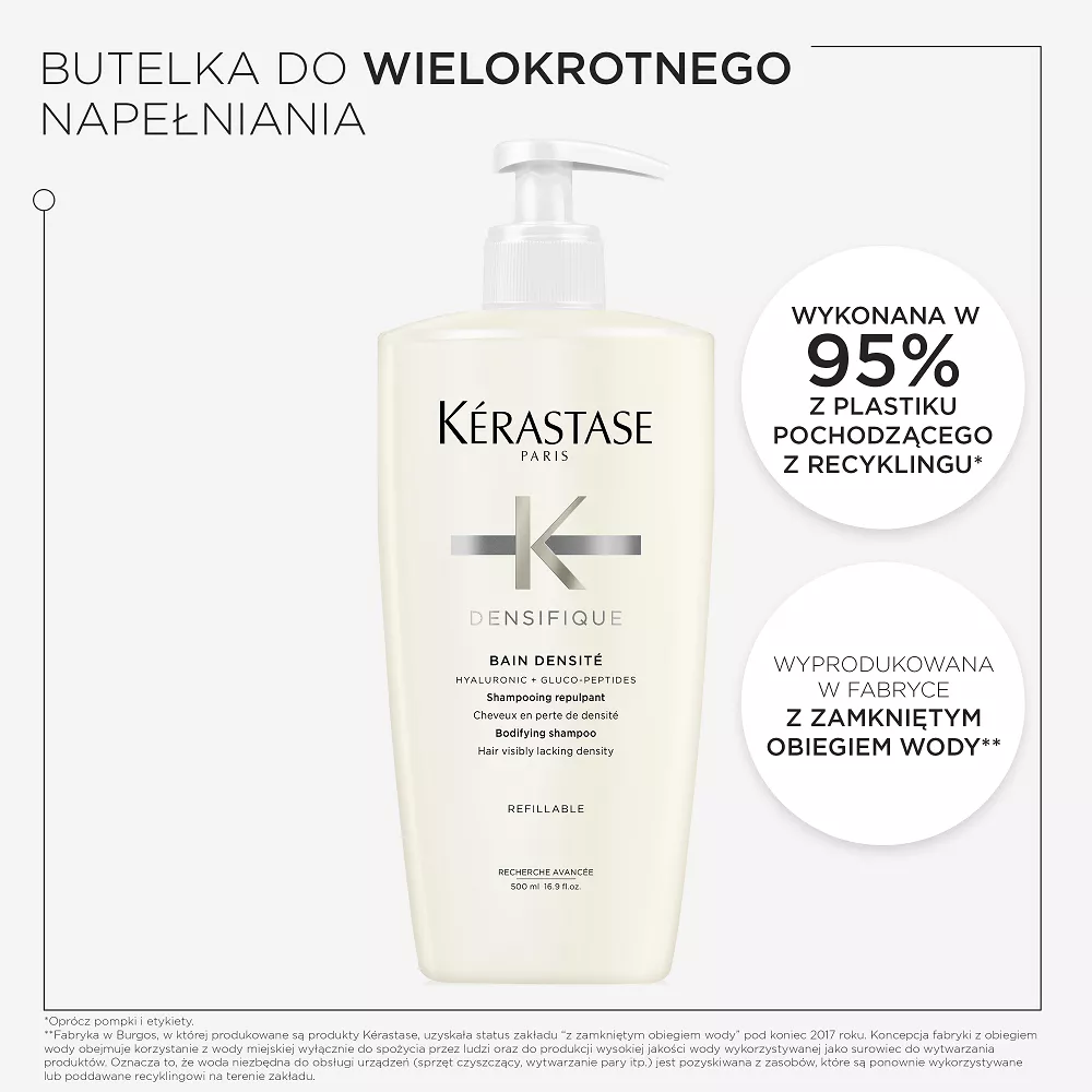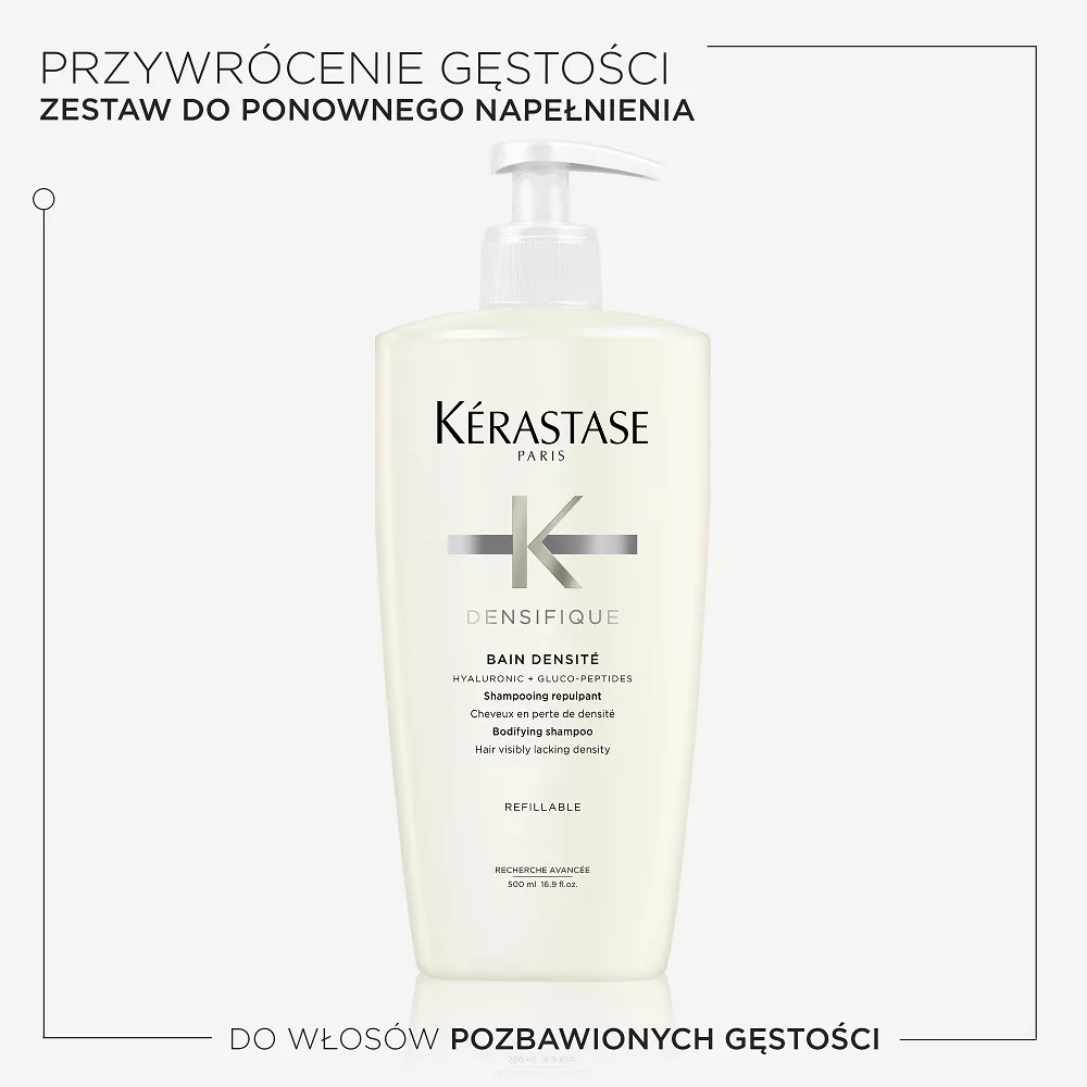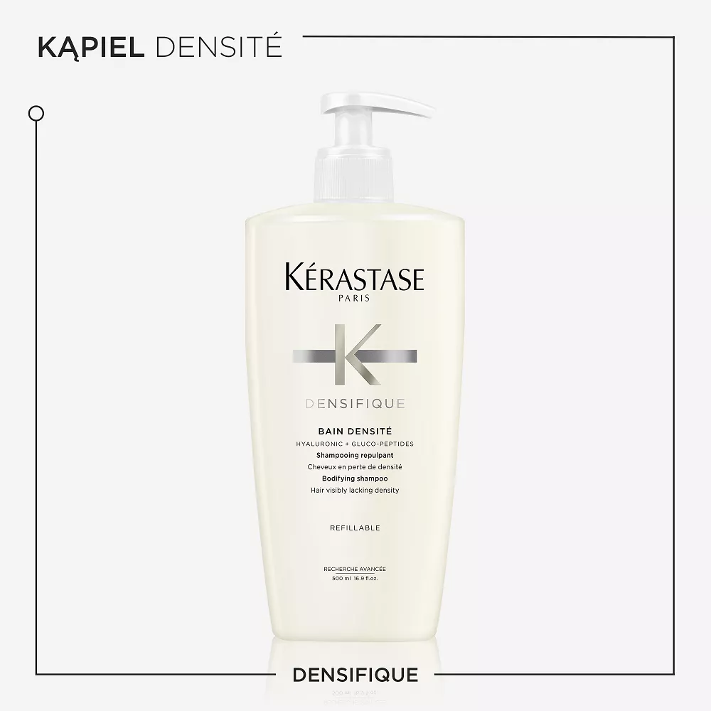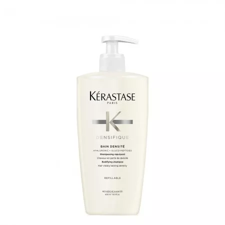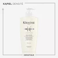 Kerastase Densifique, szampon jest przeznaczony do włosów dotkniętych problemem utraty gęstości. Kąpiel Densité wzmacnia włosy zaczynając od ich włókien i sprawia, że stają się bardziej odporne. Przywraca włosom gęstość i sprężystość sprawiając, że stają się widocznie gęstsze i grubsze.