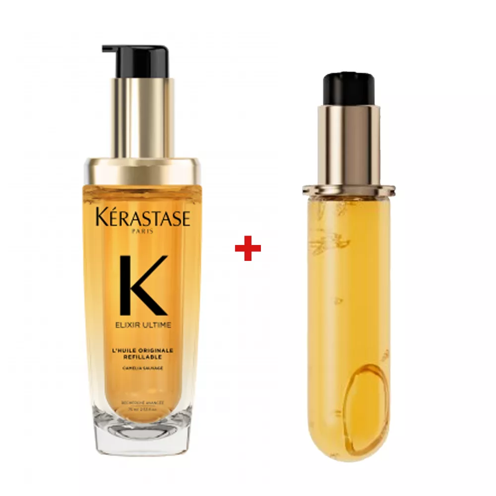 Bestsellerowy ikoniczny olejek do włosów Elixir Ultime od Kérastase teraz dostępny w opakowaniu do wielokrotnego uzupełniania. Ten olejek do włosów bez spłukiwania, nadający włosom niezapomniany blask i zapach, zapewnia miękkość i odżywienie włosów każdego rodzaju. Formuła tego niezwykle luksusowego olejku dodającego włosom blasku zawiera połączenie dzikiej kamelii i kamelii francuskiej, starannie zbieranej ręcznie w Bretanii, we Francji. Teraz w zestawie starczy na dłużej!