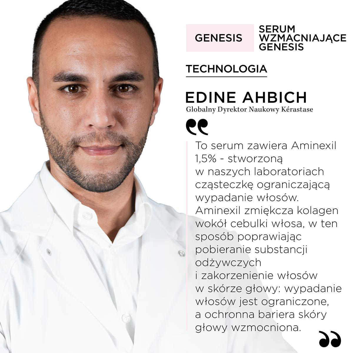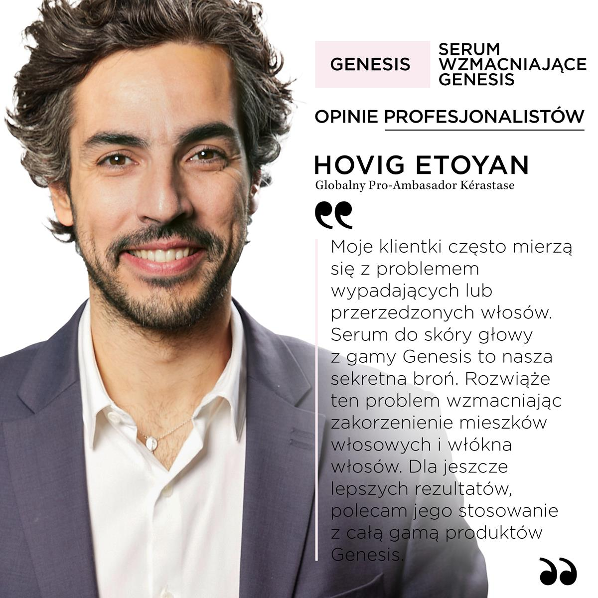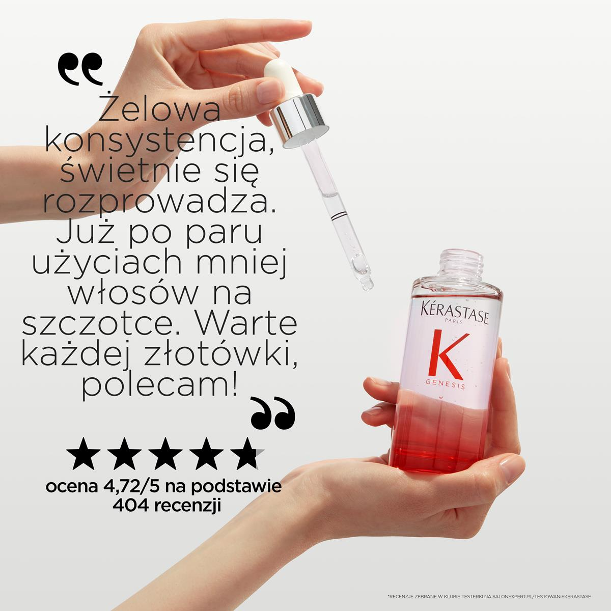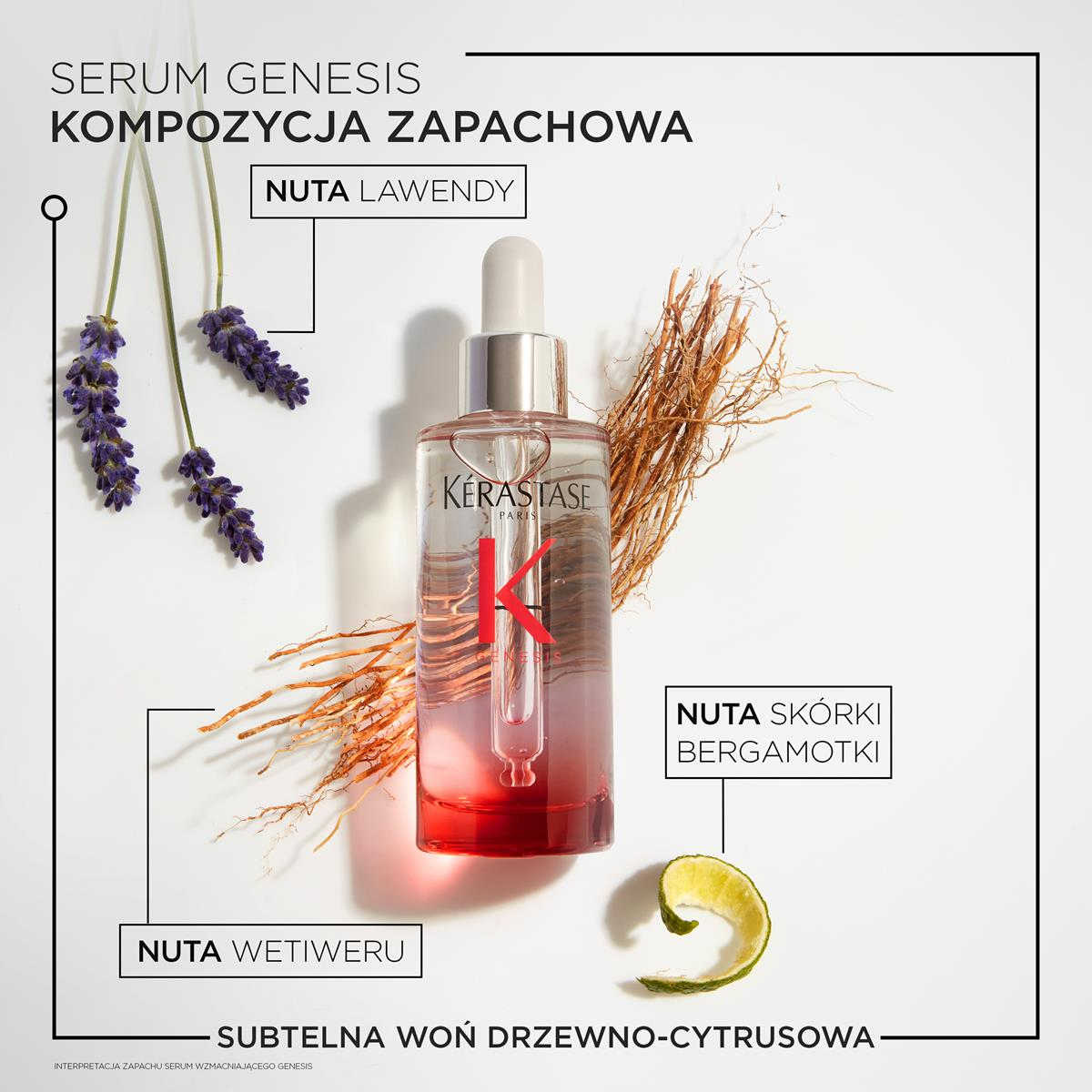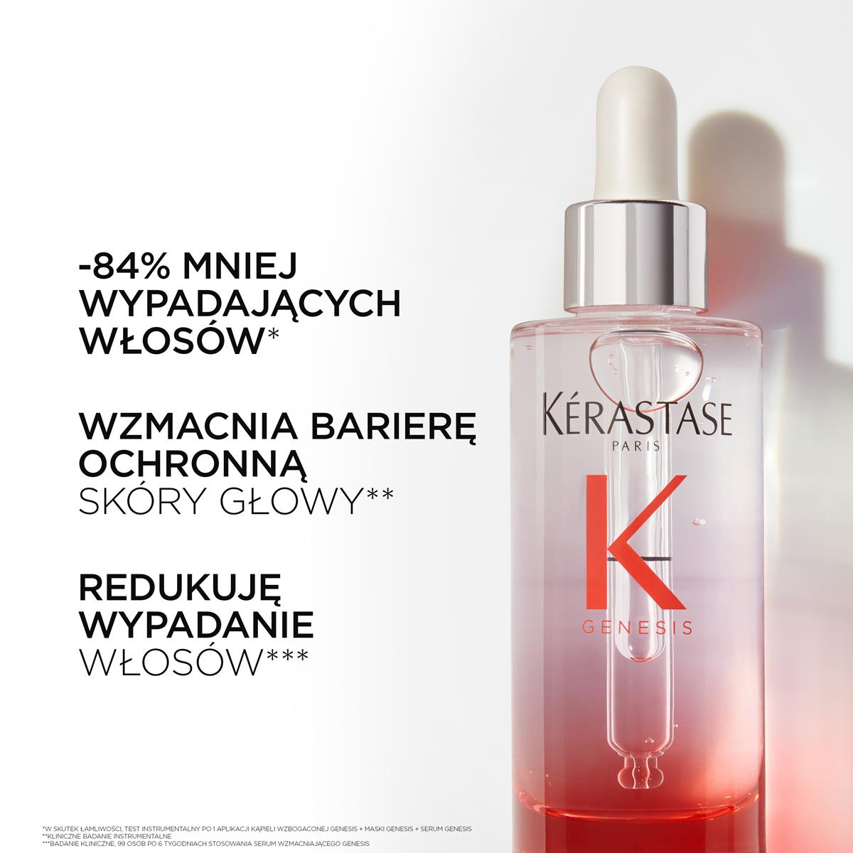Serum do włosów łamliwych i wypadających Kerastase Genesis wzmacnia pasma każdego dnia i zmniejsza ich wypadanie. W składzie znajdują wysoce skuteczne składniki aktywne, które wzmacniają włosy, zmniejszają stopień ich wypadania i poprawiają ich wygląd. Mieszki włosowe lepiej się osadzają w skórze głowy. Poza tym włosy mają zapewnione doskonałe warunki do wzrostu. Serum łagodzi podrażnienia skóry głowy i wzmacnia barierę ochronną. Kosmetyk ma żelową konsystencję, co sprawia, że produkt łatwo aplikować - nie rozlewa się on po głowie. Regularne stosowanie sprawia, że włosy są mocniejsze, pełniejsze i zdrowsze. W składzie tego kosmetyku znajduje się 1.5% aminexil, który wzmacnia osadzenie włosa w skórze głowy. Dodatkowo korzeń imbiru lekarskiego zapewnia ochronę przed szkodliwymi substancjami, zaś kofeina poprawia mikrokrążenie skóry głowy.