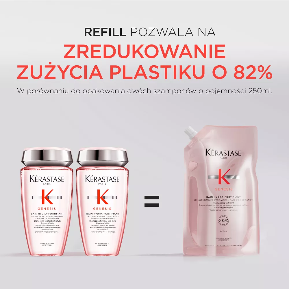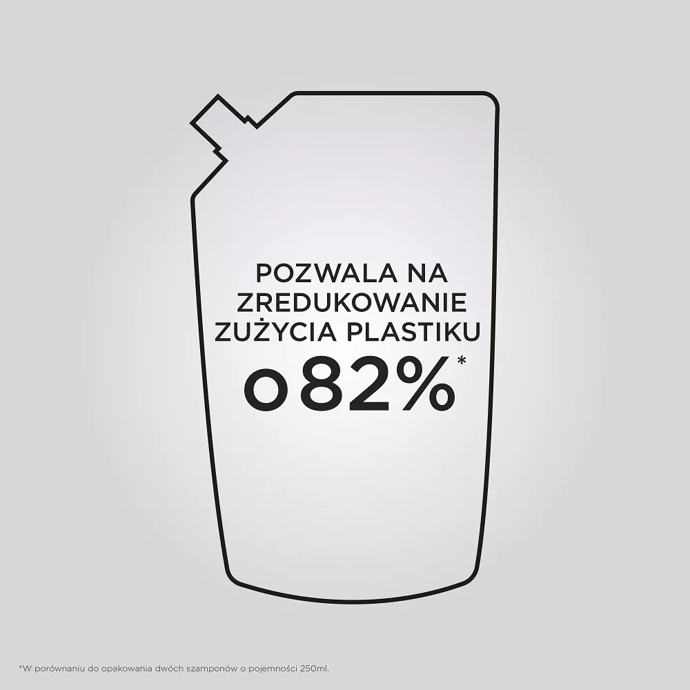 Butelka szamponu o pojemności 500ml do ponownego uzupełniania jest wykonana w 95% z plastiku pochodzącego z recyklingu* i wyprodukowana w fabryce ""z zamkniętym obiegiem wody”**, która osiągnęła 100% energii odnawialnej*** oraz z możliwością ponownego uzupełnienia wkładem uzupełniającym pozwalającym na zredukowanie zużycia plastiku o 82%****.