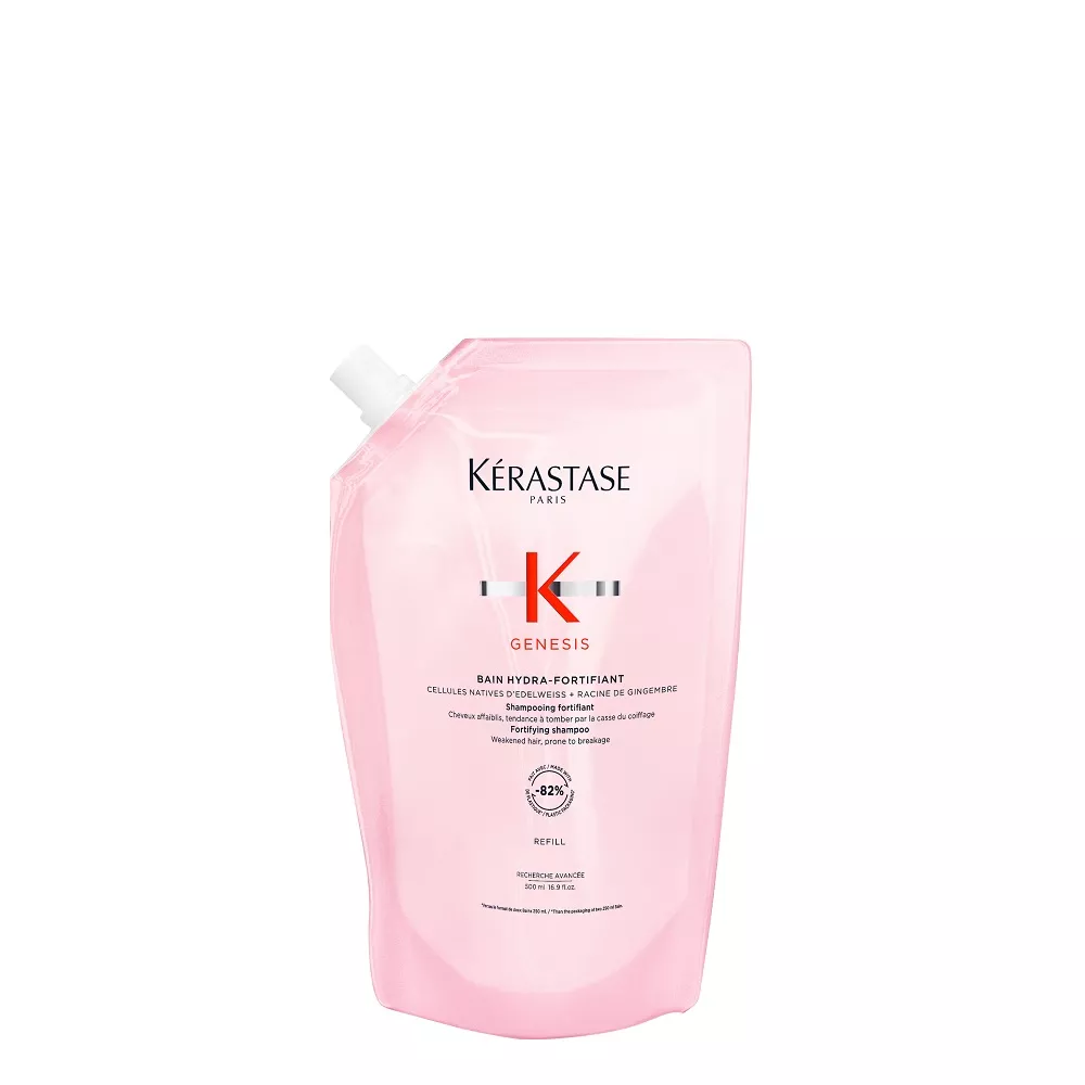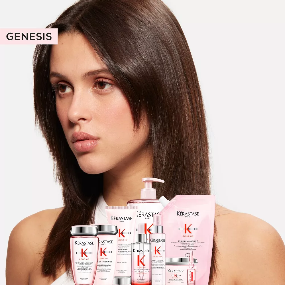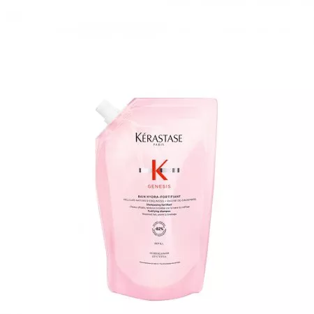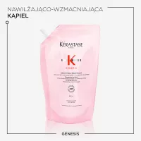 Kerastase Genesis wzmacniający szampon do włosów osłabionych, z tendencją do wypadania z powodu łamliwości. Delikatnie oczyszcza i wzmacnia włókno włosa zmniejszając ryzyko wypadania spowodowane ich łamaniem się. Ta niezwykle delikatna formuła jest idealna do włosów cienkich lub przetłuszczających się, gdyż eliminuje nadmiar sebum i cząstki zanieczyszczeń ze skóry głowy i włosów. Ma delikatne działanie oczyszczające, a jednocześnie nawilża włosy od nasady aż po końce, pozostawiając uczucie lekkości. Wzbogacona połączeniem komórek szarotki alpejskiej i korzenia imbiru formuła wzmacnia włókno, zapewniając włosom optymalną sprężystość i zmniejszając ryzyko wypadania z powodu łamliwości. Włosy stają się mocniejsze, zyskują gęstość i zdrowy wygląd.