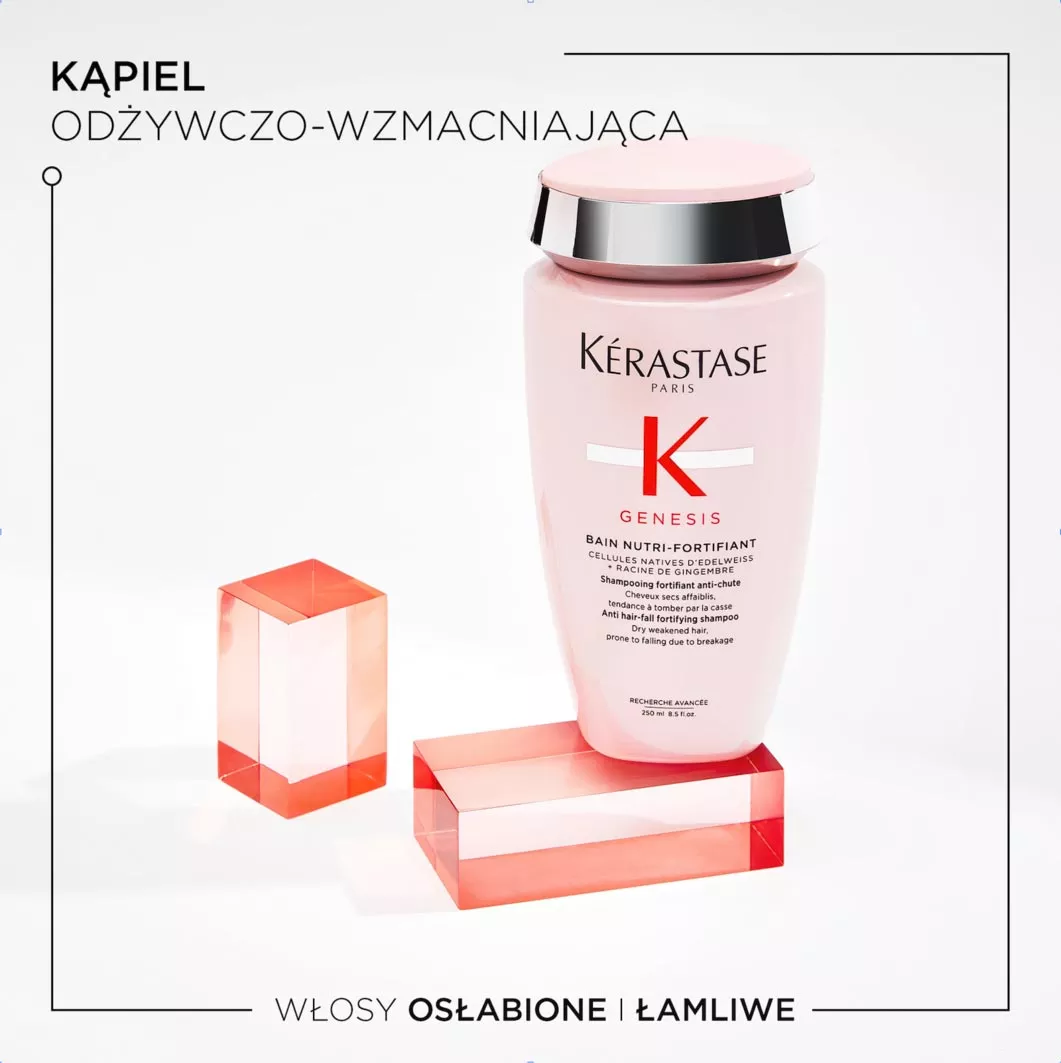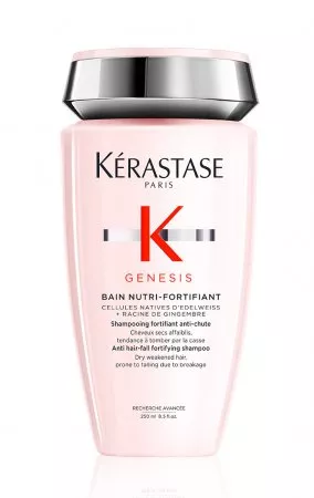 Szampon do włosów Kerastase Genesis doskonale wzmacnia i nawilża włosy słabe, łamliwe, wypadające i tracące gęstość. A do tego łagodnie oczyszcza pasma i skórę głowy. To pierwszy krok, jeśli chcesz ograniczyć wypadanie spowodowane łamliwością włosów. Bardzo delikatna formuła tego kosmetyku usuwa sebum oraz wszelkie zanieczyszczenia ze skóry głowy. Kąpiel polecana jest do włosów grubych lub suchych. W składzie znajdują się komórki macierzyste szarotki alpejskiej, która jest silnym antyoksydantem. A dodatkowo korzeń imbiru lekarskiego zwiększa odporność włosów na uszkodzenia. Włosy są lekkie, odżywione, mocne i ładnie się układają.