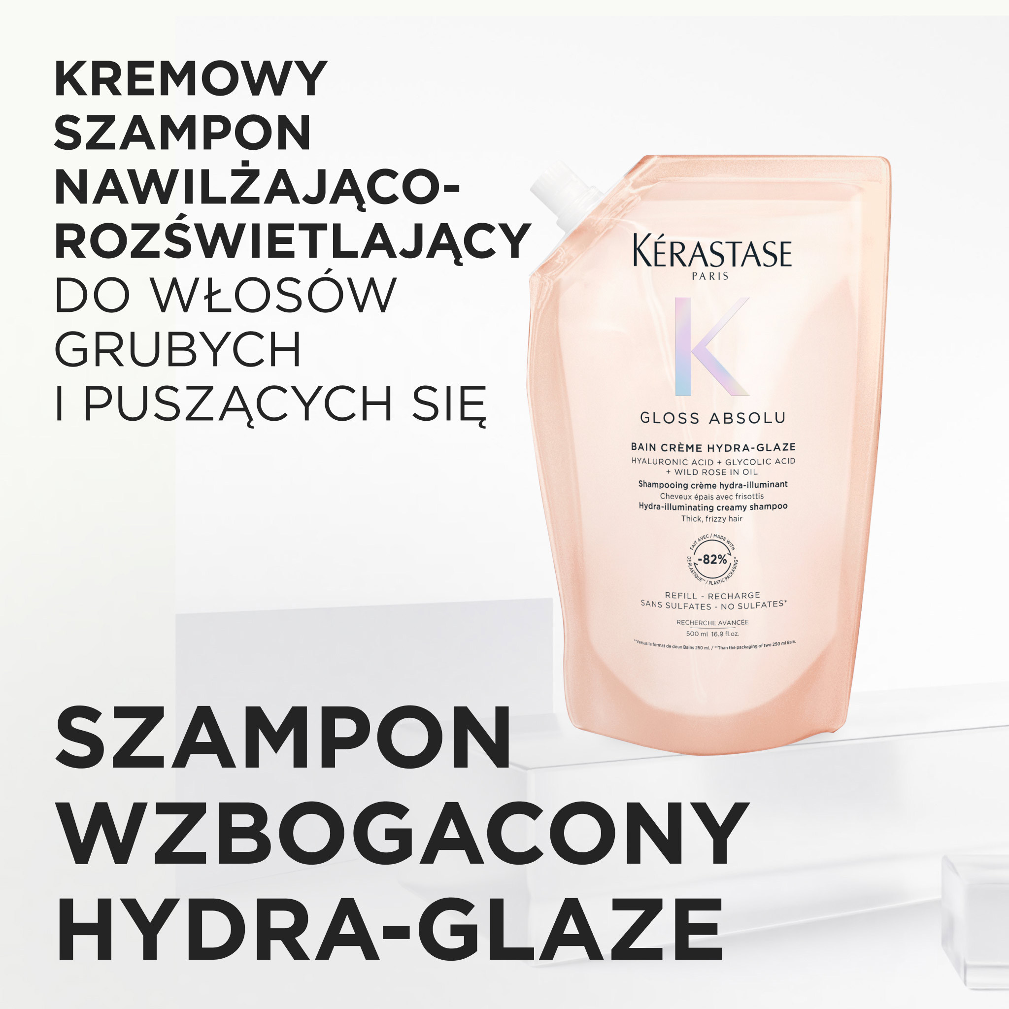 Wzbogacony szampon nawilżająco-nabłyszczający Gloss Absolu Créme Hydra-Glaze od Kérastase jest przeznaczony do pielęgnacji włosów grubych i puszących się. Jego zaawansowana formuła wzbogacona kwasem hialuronowym, kwasem glikolowym i olejkiem z dzikiej róży pomaga chronić włosy przed puszeniem, zapewniając im wymarzoną sprężystość i połysk.