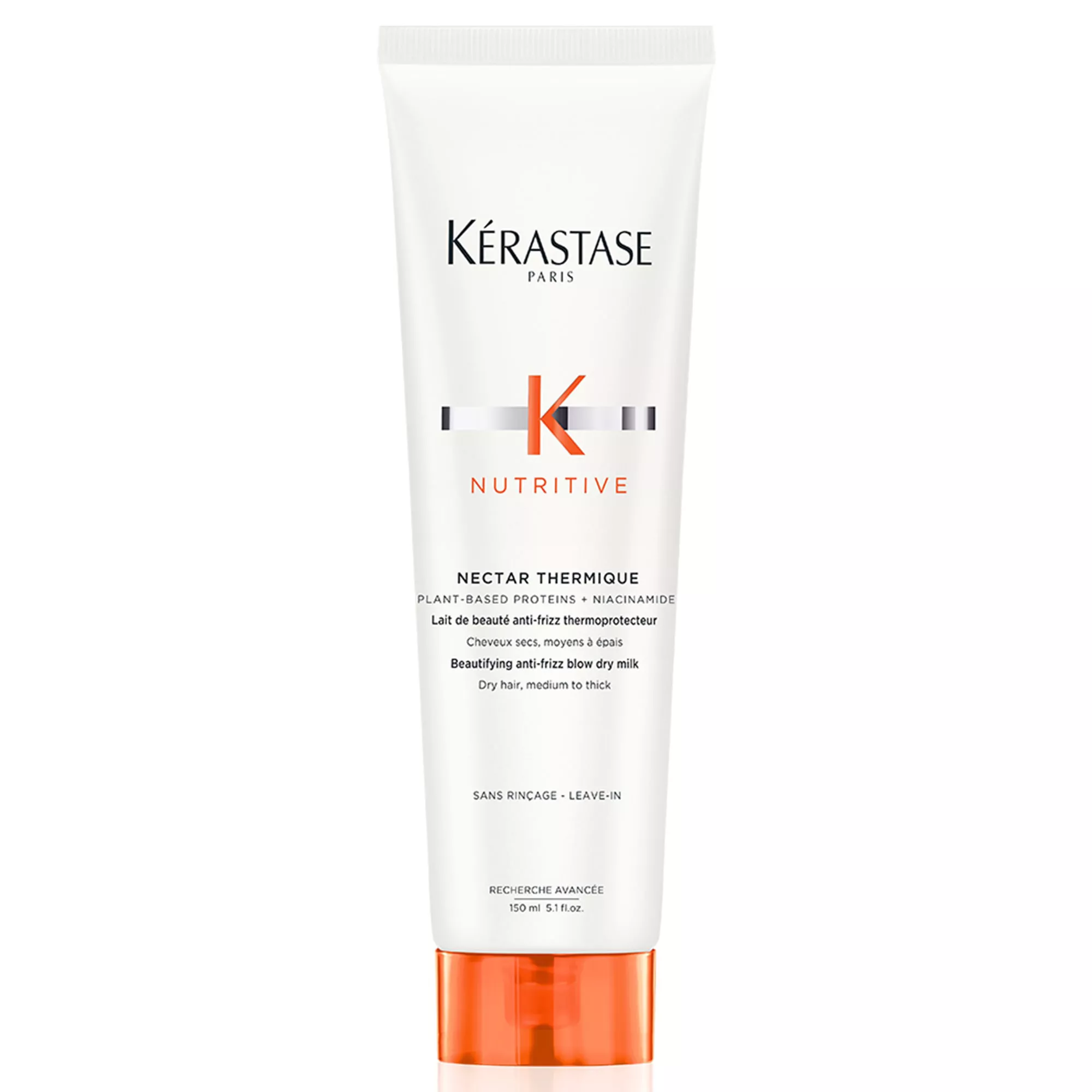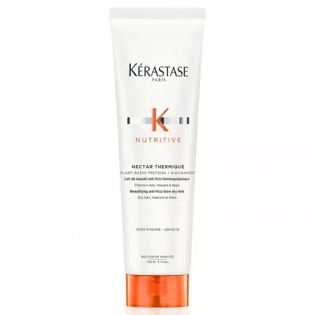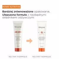Nektar termiczny Kerastase Nutritive to preparat odżywczo-ochronny do włosów suchych. To upiększające mleczko do włosów chroni suche włosy przed niszczącym wpływem stylizacji na gorąco i zawiera polimery zapobiegające przesuszaniu, dzięki którym suche włosy są dobrze odżywione, lśniące, wygładzone i łatwo się rozczesują. Dostarcza niezbędnych składników odżywczych, dzięki którym formuła doskonale odżywia i wzmacnia włosy. Lekki, biały krem nie obciąża włosó i zapewnia im termoochronę do 230 stopni Celsjusza. Mleczko ponadto ogranicza puszenie włosów. Tubkę wykonano w 45% z tworzywa z recyclingu.
