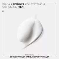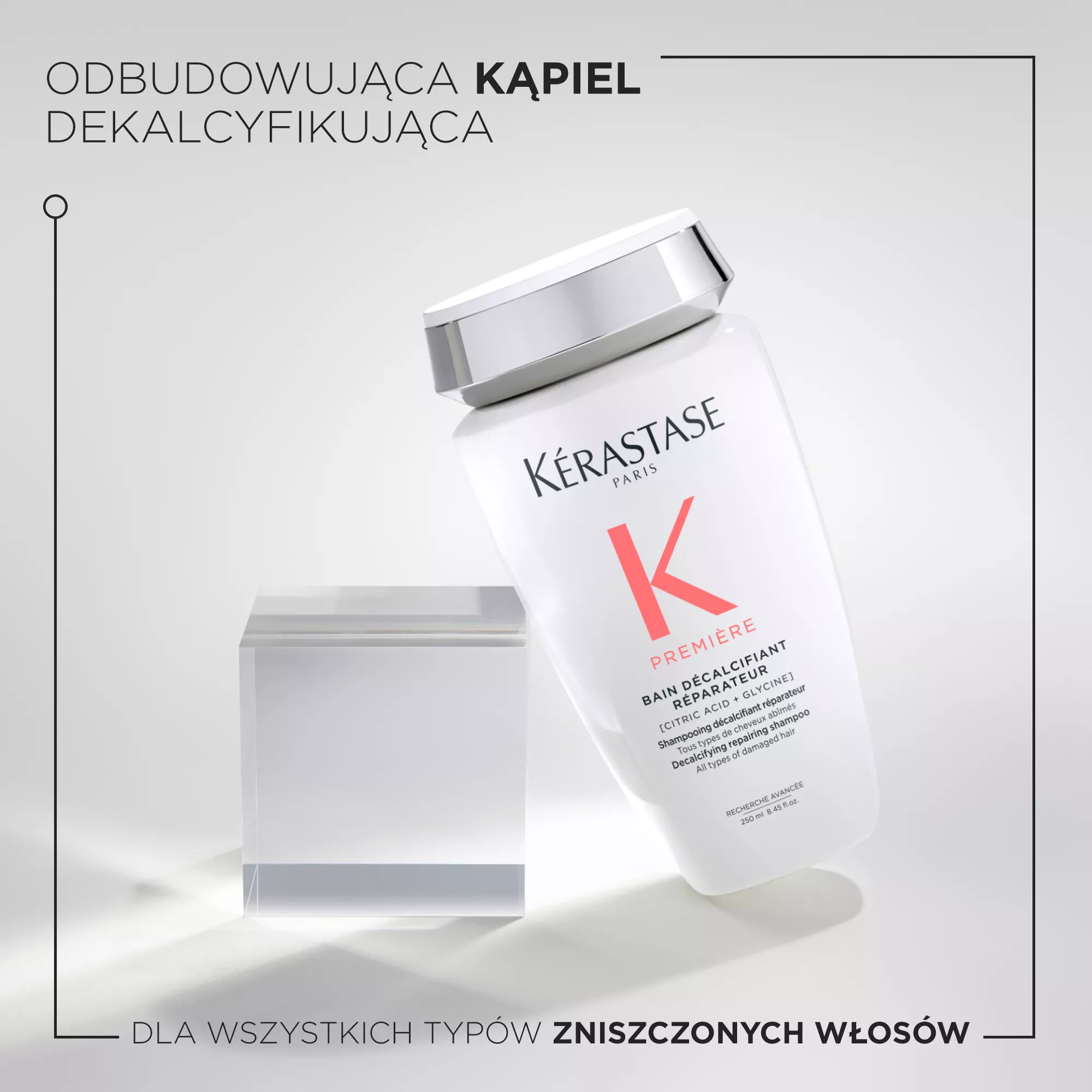 Odbudowująca kąpiel dekalcyfikująca Première od Kérastase to chelatujący szampon regenerujący do włosów zniszczonych. Szampon o bogatej formule i podwójnym działaniu, usuwający calcium (wapń) oraz wzmacniający i regenerujący zniszczone włosy. Działa we wnętrzu i na powierzchni włosa. Szampon ma białą, kremową konsystencję oraz obficie się pieni. Pozbądź się niszczącego włosy calcium dzięki temu profesjonalnemu szamponowi od Kérastase, który łagodnie oczyszcza włosy i skórę głowy. Regeneruje włosy od wewnątrz, zmniejsza ich łamliwość i przywraca im zdrowy wygląd i połysk.