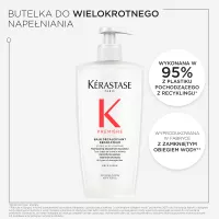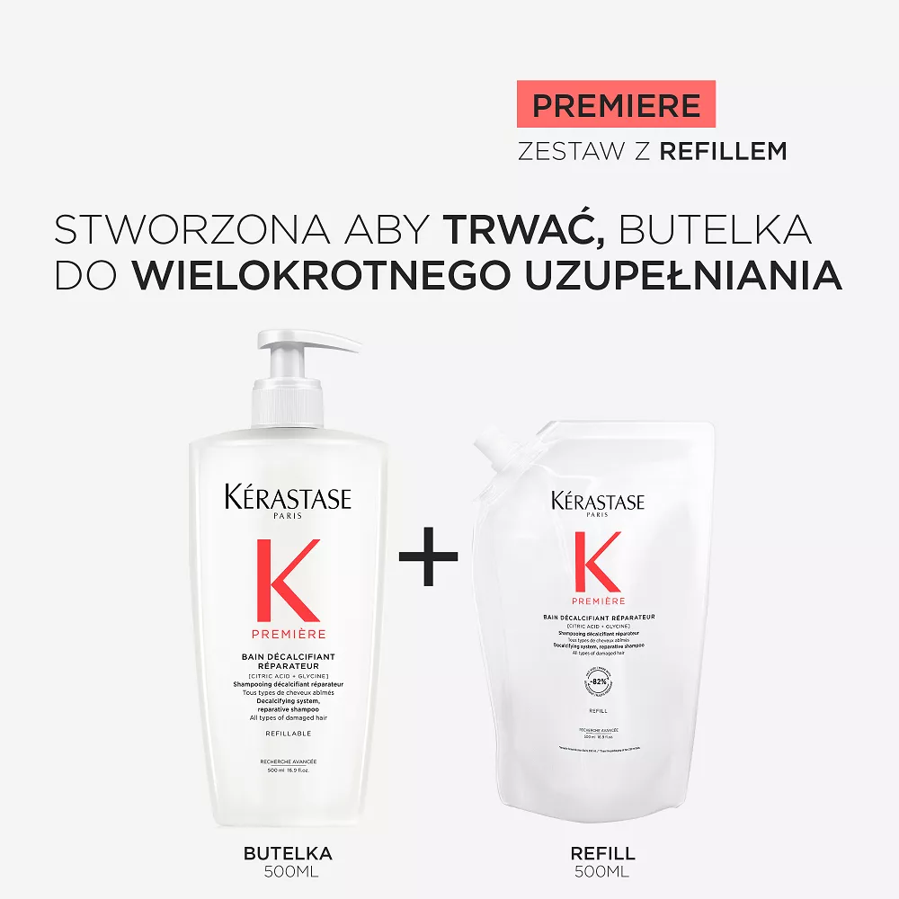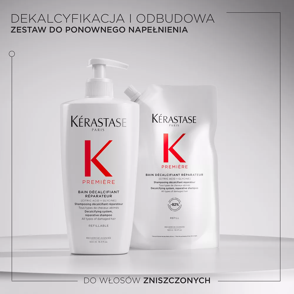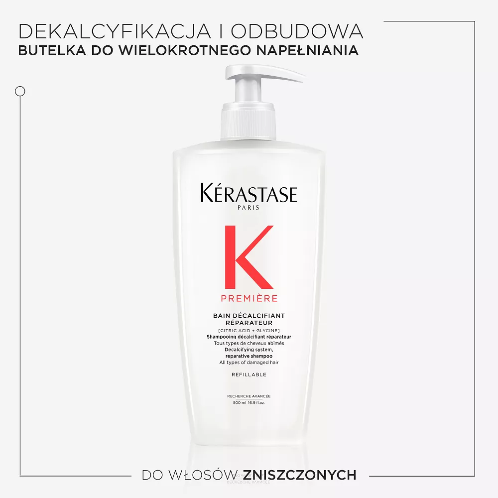Zalecamy, aby przed nałożeniem warstwy Odbudowującej Kąpieli dekalcyfikującej Kérastase Première nałożyć na mokre włosy najpierw warstwę ""Ultra-naprawczego"" Koncentratu dekalcyfikującego Kérastase Première, a następnie warstwę Odbudowującej Kąpieli dekalcyfikującej Kérastase Première i nie spłukiwać ich w celu osiągnięcia najlepszych rezultatów. Szampon można łączyć również z innymi produktami z gamy Première, jak np. z Odbudowująco Regenerującą Maską dla zapewnienia dodatkowego działania naprawczego i odbudowującego.