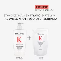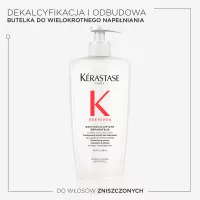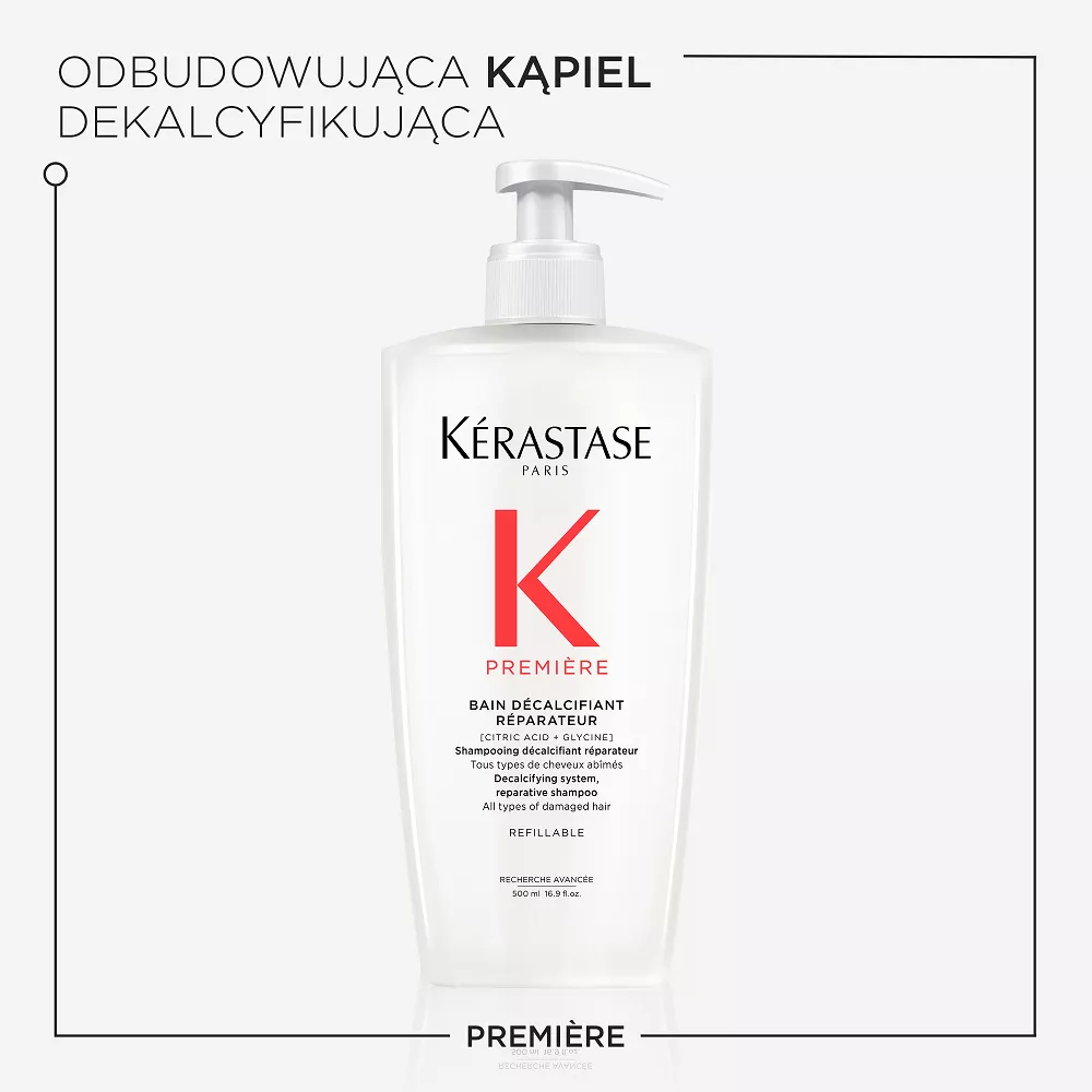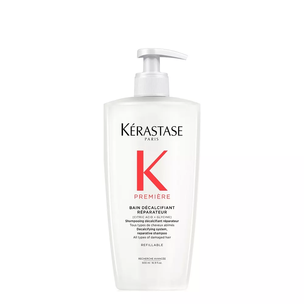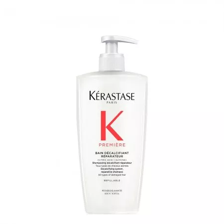 Odbudowująca Kąpiel dekalcyfikująca Kérastase Première to dekalcyfikujący szampon naprawczy do wszystkich typów włosów osłabionych zabiegami chemicznymi oraz zniszczonych. Ten szampon do użytku profesjonalnego delikatnie oczyszcza skórę głowy i włosy usuwając wapń, które osłabia włosy zniszczone. Naprawia włosy od wewnątrz, redukuje ich łamliwość i przywraca zdrowy wygląd. Biały, kremowy szampon, który zmienia się w luksusową piankę ma podwójne działanie: eliminuje nadmiar wapnia z twardej wody, który uszkadza osłabione już bądź rozjaśniane włosy i sprawia, że są one matowe, bez życia i wiotkie. Przywraca również połączenia keratynowe w trzonie włosa, naprawiając włosy. Włosy stają się gładkie i łatwe w układaniu, lśniące i sprężyste.