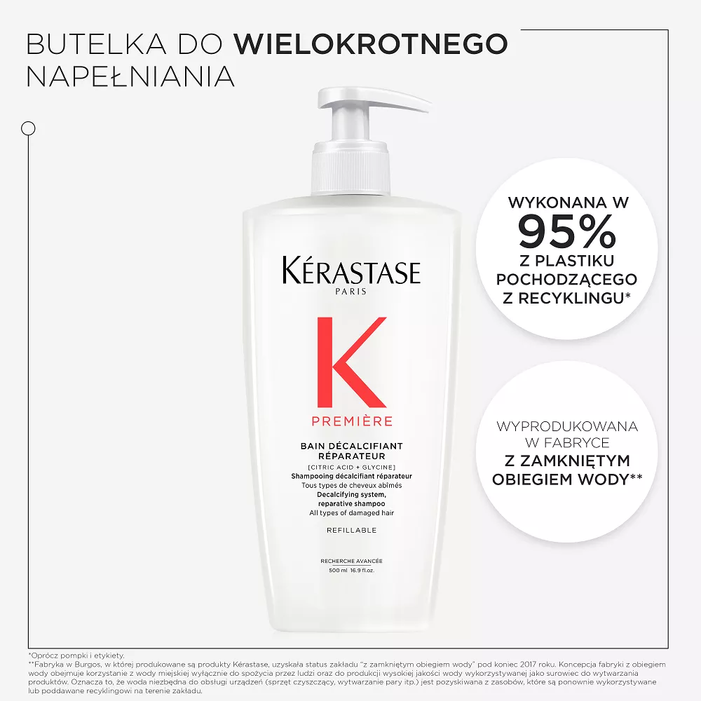 Butelka szamponu o pojemności 500ml do ponownego uzupełniania jest wykonana w 95% z plastiku pochodzącego z recyklingu* i wyprodukowana w fabryce ""z zamkniętym obiegiem wody”**, która osiągnęła 100% energii odnawialnej*** oraz z możliwością ponownego uzupełnienia wkładem uzupełniającym pozwalającym na zredukowanie zużycia plastiku o 82%****.