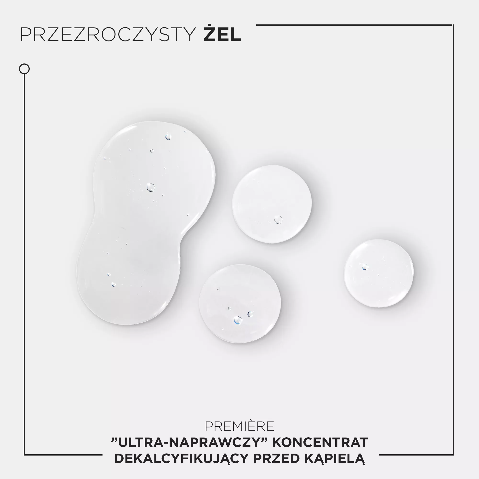 Ultra-naprawczy" koncentrat dekalcyfikujący przed kąpielą Première od Kérastase to pielęgnacja przed użyciem szamponu o podwójnym działaniu chelatującym i regenerującym włosy zniszczone. Oczyszcza z clacium (wapnia) i wzmacnia włosy, które stają się mocniejsze, gładsze i bardziej lśniące. Produkt ma konsystencję przezroczystego żelu.