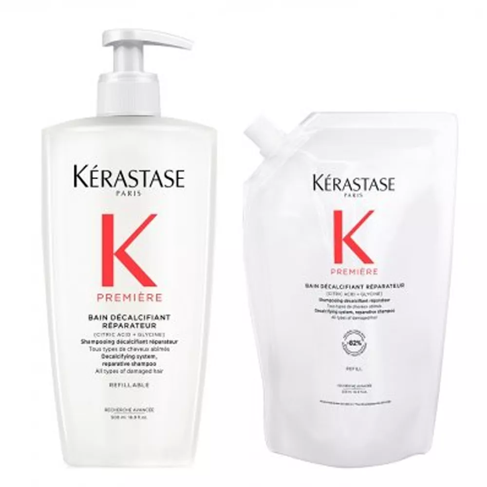 Odbudowująca Kąpiel dekalcyfikująca Kérastase Première to dekalcyfikujący szampon naprawczy do wszystkich typów włosów osłabionych zabiegami chemicznymi oraz zniszczonych. Ten szampon do użytku profesjonalnego delikatnie oczyszcza skórę głowy i włosy usuwając wapń, które osłabia włosy zniszczone. Naprawia włosy od wewnątrz, redukuje ich łamliwość i przywraca zdrowy wygląd. Biały, kremowy szampon, który zmienia się w luksusową piankę ma podwójne działanie: eliminuje nadmiar wapnia z twardej wody, który uszkadza osłabione już bądź rozjaśniane włosy i sprawia, że są one matowe, bez życia i wiotkie.