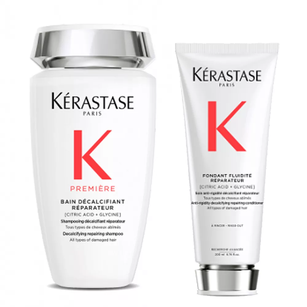 Naprawcza kąpiel dekalcyfikująca Première to chelatujący szampon regenerujący do każdego rodzaju włosów nadmiernie obciążonych zabiegami lub włosów zniszczonych. Ten profesjonalny szampon łagodnie oczyszcza skórę głowy i włosy, jednocześnie usuwając calcium, które jeszcze bardziej osłabia włosy. Regeneruje włosy od wewnątrz, zmniejsza ich łamliwość i przywraca zdrowy wygląd. Pierwsza odżywka chelatująco-regenerująca od Kérastase do każdego typu włosów zniszczonych. Przywraca włosom elastyczność, wzmacniając ich włókna. Natychmiast przywraca nawilżenie i płynność włosom nadmiernie obciążonym zabiegami lub włosom rozjaśnianym.