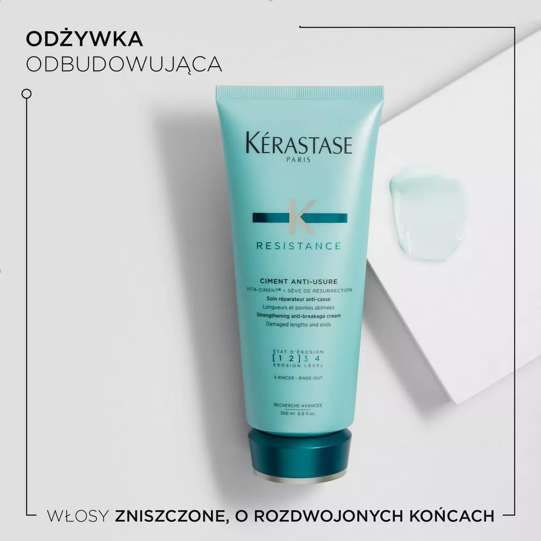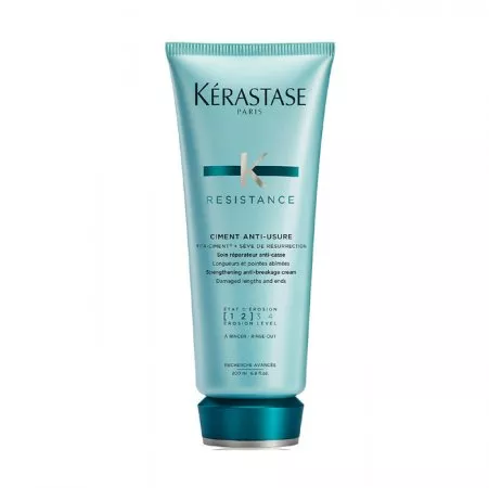 Odżywka Kerastase Resistance Ciment Anti-Usure odbudowuje strukturę włosów zniszczonych. Nowy składnik aktywny Vita TopSeal uzupełnia naturalną zewnętrzną warstwę włosa. Efekt widoczny jest bardzo szybko. Włosy stają się gładkie, lśniące, mocne i sprężyste. Znów zaczynają się układać i są odporne na uszkodzenia. Cement Kerastase to kosmetyk, który został opracowany specjalnie z myślą o włosach bardzo zniszczonych i osłabionych. W składzie tego kosmetyku znajduje się pro-keratyna, która odbudowuje strukturę włosów (to białko imitujące funkcję keratyny). Ponadto ceramidy uzupełniają ubytki międzykomórkowe i wzmacniają każde pasmo od wewnątrz. Efekt regeneracji wzmacnia ekstrakt z rośliny rezurekcyjnej.