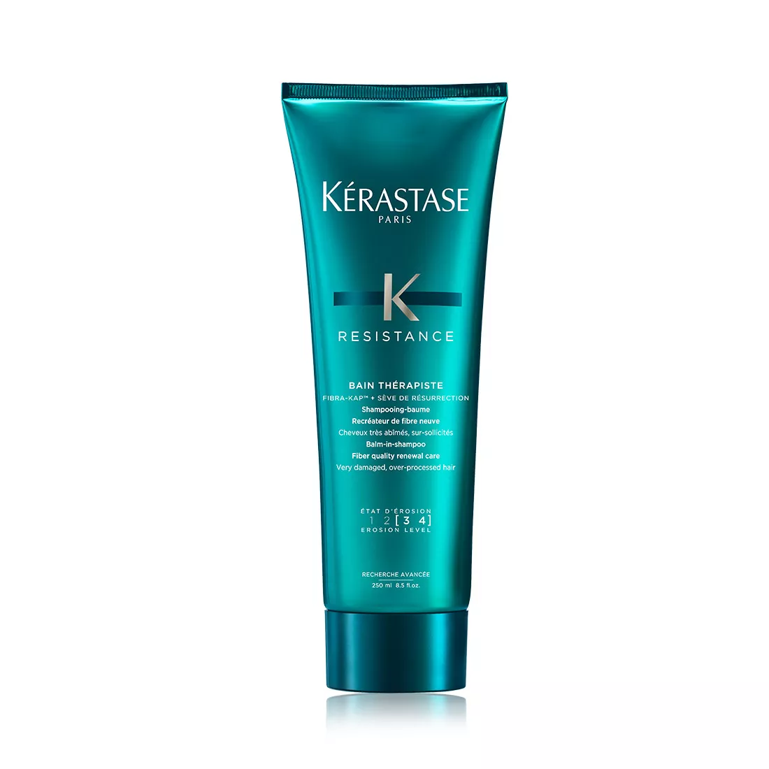 Produkt ten powstał z myślą o włosach bardzo zniszczonych i osłabionych. Kąpiel Kerastase Resistance Therapiste to pierwszy balsam o unikalnej żelowej konsystencji, który otula włókno włosa w trakcie kąpieli, ograniczając tarcie. Produkt ten swoją skuteczność opiera na systemie FIBRA-KAP. Kapy są to białka współwystępujące z keratyną i stanowią 50% włókna włosa. Są to mikroproteiny łączące i wiążące ze sobą keratynę. Ogrywają one bardzo ważną rolę. Pierwsze włosy zawierają duże ilość KAPów natomiast w zniszczonych zanikają. Wtedy struktura włosa rozpada się. Dlatego też KAPy są niezbędne i zapewniają spójność włókna włosa. System FIBRA-KAP zastępuje brakujące KAPy i reaktywuje ich syntezę. Ponadto zawiera aż 6 aminokwasów, hydrolat białka pszenicy i ekstrakt z rośliny rezurekcyjnej, który ma właściwości regenerujące.