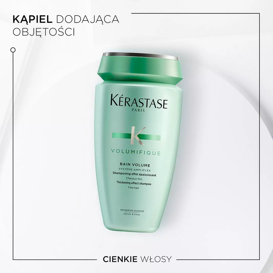 Szampon, którego pielęgnacyjna formuła jest idealnie dostosowana dla potrzeb włosów cienkich, delikatnych i osłabionych, którym brakuje objętości i witalności. Kąpiel Kerastase Volumifique łączy w sobie podwójne efekty - unosi i dodaje objętości włosom formując i budując fryzurę, a jednocześnie wzmacnia ich delikatną strukturę. Nadaje efekt pogrubienia włókna włosa, dzięki czemu fryzura natychmiast jest widocznie pełniejsza i bujniejsza. Nie obciąża włosów, dzięki lekkiej konsystencji. Kontroluje puszenie się włosów i dodaje im zdrowego blasku.