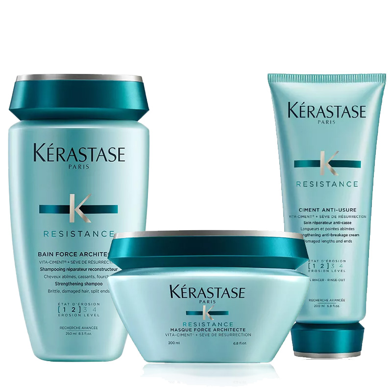 Szampon Kerastase Resistance Bain Force Architecte jest skierowany do włosów ekstremalnie zniszczonych. Włosy kruche, łamliwe, mało elastyczne, z rozdwojonymi końcami potrzebują silnej odbudowy i wzmocnienia. Odżywka Kerastase Resistance Ciment Anti-Usure odbudowuje strukturę włosów zniszczonych. Nowy składnik aktywny Vita TopSeal uzupełnia naturalną zewnętrzną warstwę włosa. Stosowanie maski odbudowującej wzmacnia Twoje włosy, uelastycznia i wygładza na całej długości. Już w krótkim czasie odzyskają zdrowy wygląd, staną się silne, sprężyste, odporne i podatne na układanie.