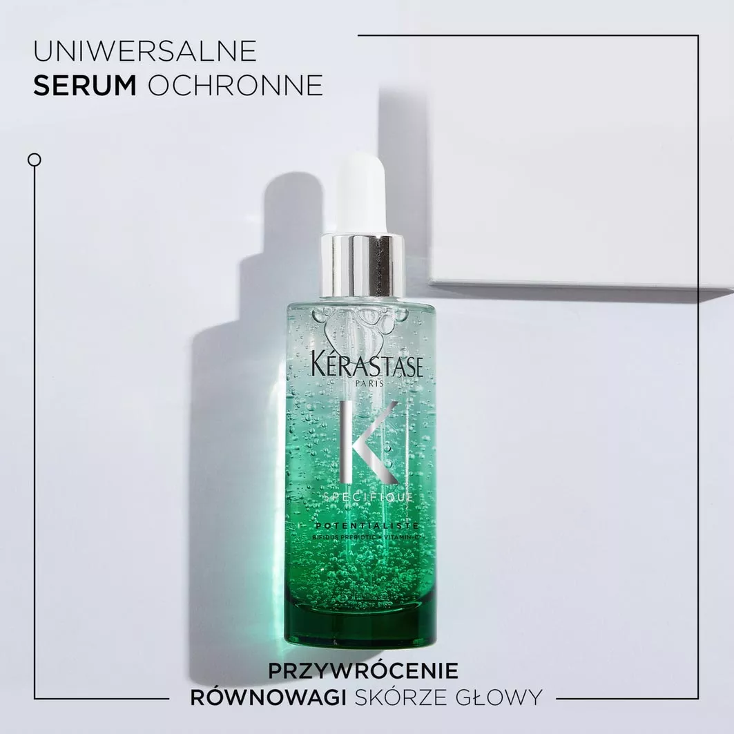 Ochronne serum Kerastase Specifique Potentialiste działa antyoksydacyjnie i przywraca równowagę skórze głowy. Kosmetyk polecany do każdego typu skóry głowy, przede wszystkim zaś: suchej, wrażliwej, normalnej, przetłuszczającej się. Specjalnie skomponowane składniki wspierają mikrobiom skóry głowy i tworzą na niej swego rodzaju tarczę ochronną przed negatywnymi czynnikami zewnętrznymi. Serum chroni mikroorganizmy żyjące na skórze głowy i pomaga w codziennej pielęgnacji. Włosy rosną zdrowsze, są mocne i piękne.