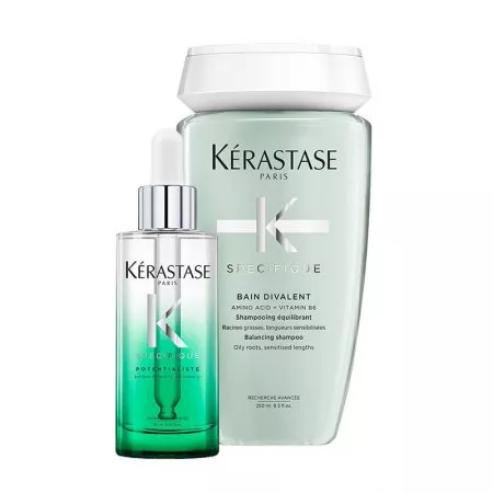 Przywracająca równowagę pielęgnacja od Kerastase o trwałych działaniu do włosów przetłuszczających się u nasady i uwrażliwionych na długościach. Kosmetyki z tej linii równoważą poziom sebum i jednocześnie nawilżają suche partie włosów, pozostawiając je cudownie miękkie i odżywione, a także przyjemnie świeże. Kerastase Specifique Divalent to kompleksowa rutyna pielęgnacyjna, która zapewnia świeże, zdrowo wyglądające włosy od nasady po same końce. W składzie kosmetyków znajdują się aminokwasy, witaminy, ceramidy i mentol.