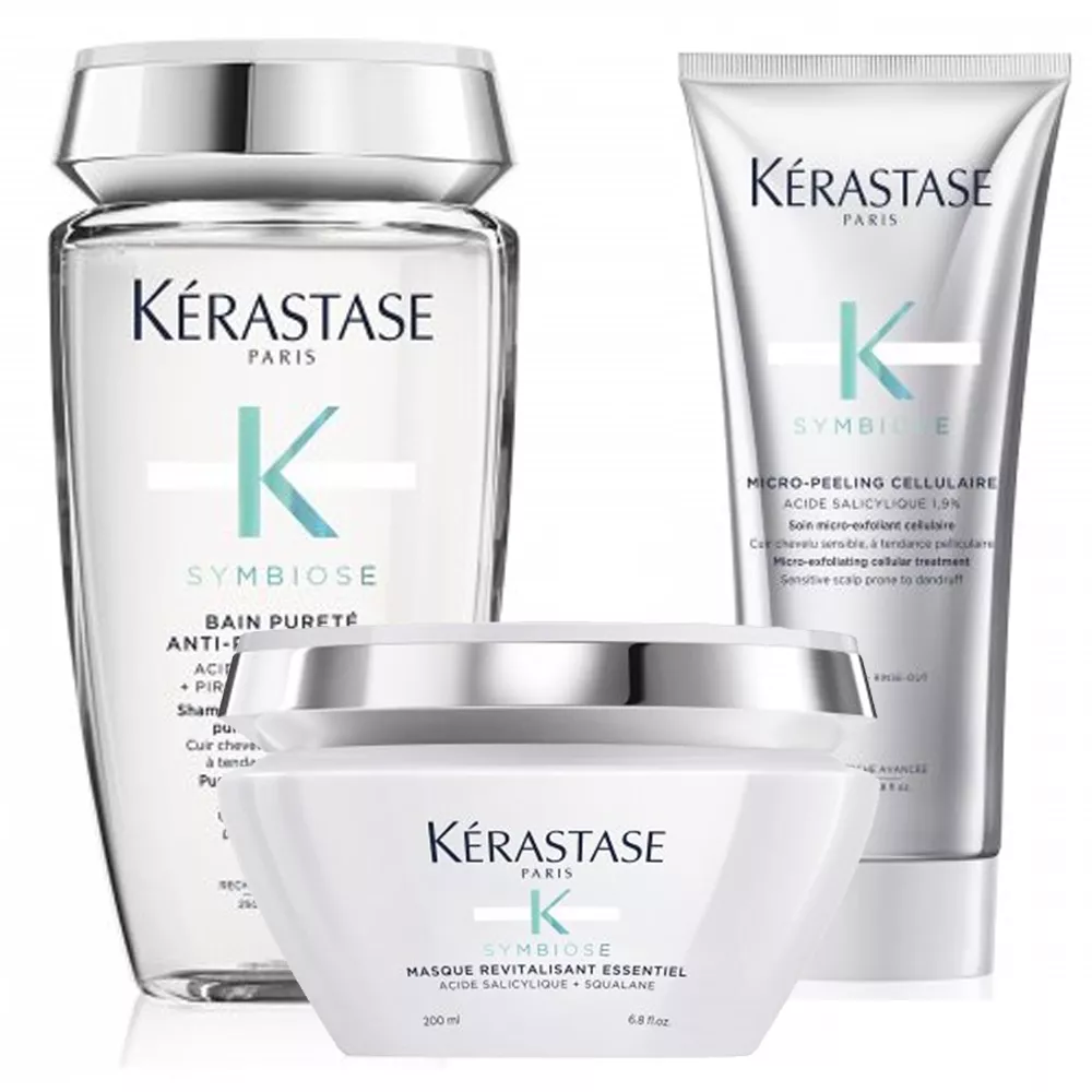 Oczyszczająca kąpiel przeciwłupieżowa do włosów Kerastase Symbiose Anti-Pelliculaire oczyszcza i wspiera wymianę komórek naskórka głowy. Szampon o przezroczystej, płynnej konsystencji przyjemnie się pieni i walczy z widocznymi oznakami łupieżu. Peeling przeciwłupieżowy do skóry głowy Kerastase Symbiose skutecznie wspiera wymianę komórek naskórka skóry głowy. Ten innowacyjny produkt w sposób chemiczny i mechaniczny złuszcza martwe komórki, a przy tym bezpiecznie rozpuszcza je oraz płatki łupieżu. Intensywnie rewitalizująca maska do włosów zniszczonych ze skłonnością do łupieżu Kerastase Symbiose Revitalisant Essentiel charakteryzuje się, bogatą, kremową i ultrapielęgnującą formułą.