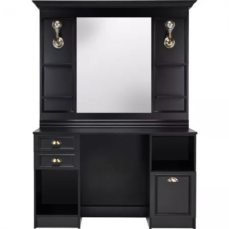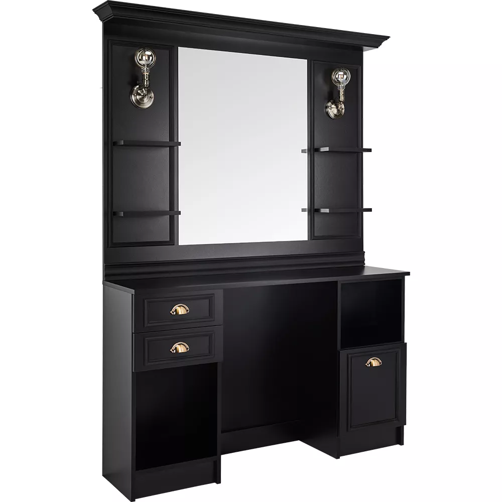 Konsoleta LEXUS to świetne rozwiązanie do salonów barberskich i fryzjerskich – bo dlaczego nie? Utrzymana w stylu art déco, nawiązuje do minionych epok i tworzy niepowtarzalny wystrój w salonie. Jest wyposażona w otwarte półki, szuflady i szafkę dzięki czemu wszystkie niezbędne narzędzia i kosmetyki będą w zasięgu ręki. Świetnie wkomponuje się we wnętrza zarówno industrialne, jak i te bardziej rustykalne i eklektyczne. Pasuje zarówno do ciemnych nasyconych kolorów i cegieł, jak i do surowych białych ścian. Wspaniały mebel. W 48H mamy go dla Was w płycie meblowej w kolorze czarny mat lub w ciemnym wenge w wersji jednostanowiskowej, ale na zamówienie zrobimy go dla Was w wersji z miską, w wersji wielostanowiskowej lub spersonalizowaną pod Wasz wymiar.