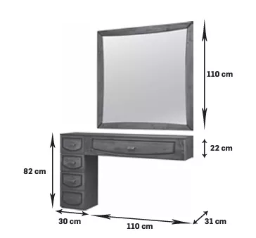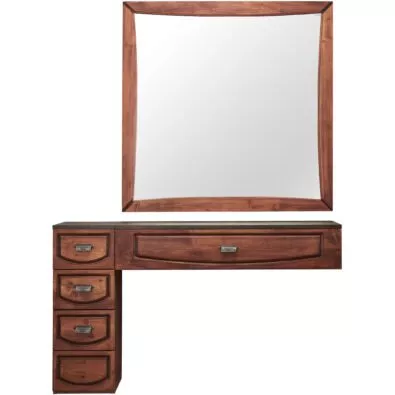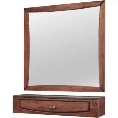 Konsoleta barberska Ayala Ragnar składa się z lustra i szuflady. Rama lustra i front szuflady wykonane z frezowanego drewna. Blat z płyty meblowej ze skóropodobnym wykończeniem.