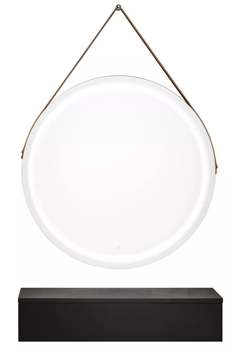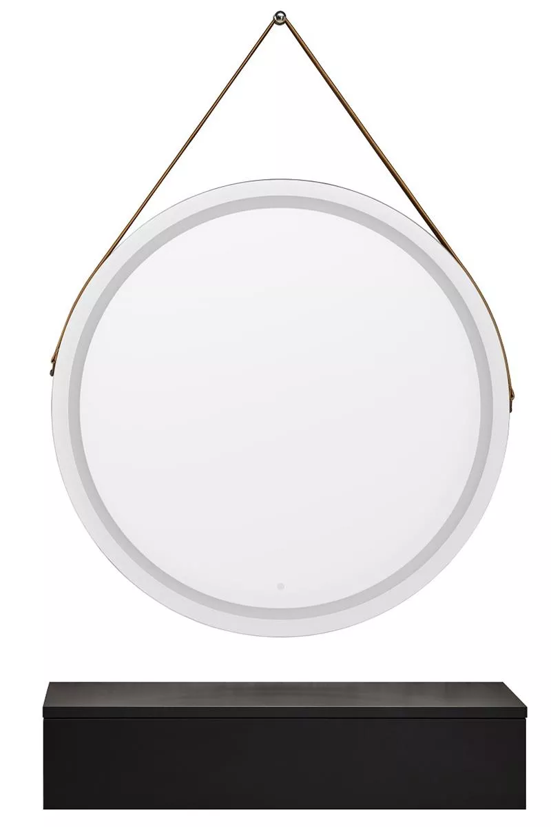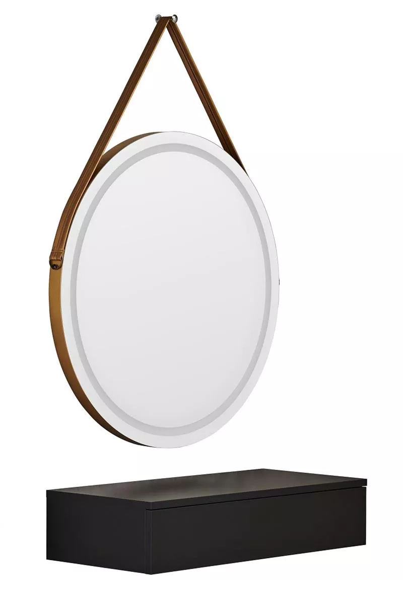 Nowość od marki Ayala! Konsoleta Holly to okrągłe złote lustro na złotym pasie + oświetlenie LED lustra, a do tego półka z szufladą (wykonana z płyty meblowej w wybranej kolorystyce).