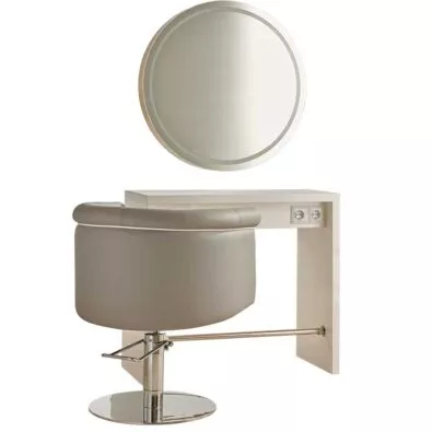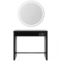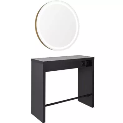 Konsoleta wykonana z płyty meblowej. Wyposażona w dwa gniazdka elektryczne oraz chromowany lub czarny podnóżek.