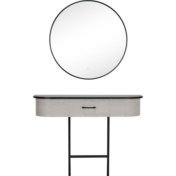 Podświetlane lustro i front w połączeniu z wybraną płytą meblową oraz chropowatą ramą lustra i podnóżka tworzą wyjątkową kompozycję, która harmonijnie wplata się w najnowsze wnętrzarskie trendy.