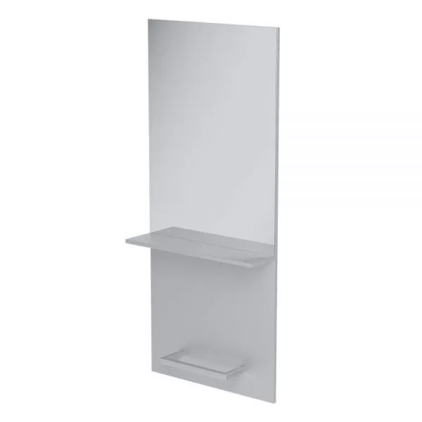 Konsoleta fryzjerska została wykonana z płyty laminowanej i wzbogacona o szklaną półkę oraz metalowy podnóżek.