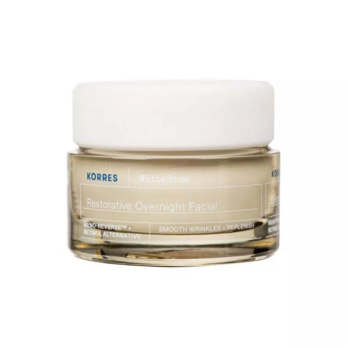 Odkryj wyjątkową formułę kremu Korres White Pine Restorative Overnight Facial Cream, który został stworzony z myślą o potrzebach skóry po menopauzie. Ten naprawczy krem na noc łączy zaawansowaną technologię Meno-Reverse™, wyciąg z białej sosny oraz roślinną alternatywę retinolu, aby zapewnić Twojej skórze odżywienie i regenerację podczas snu.