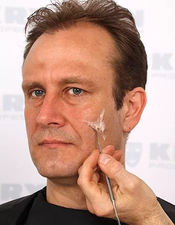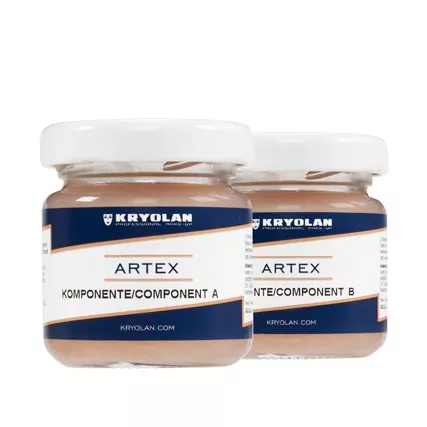 Składniki Kryolan Artex należy dokładnie wymieszać w równych proporcjach (1:1). Aplikować bezpośrednio na skórę, tworząc pożądany efekt. Proces utwardzania rozpoczyna się po 5-6 minutach. Po wyschnięciu można nałożyć dodatkowe kolory z palety Body Illustration Color lub kremową farbę.