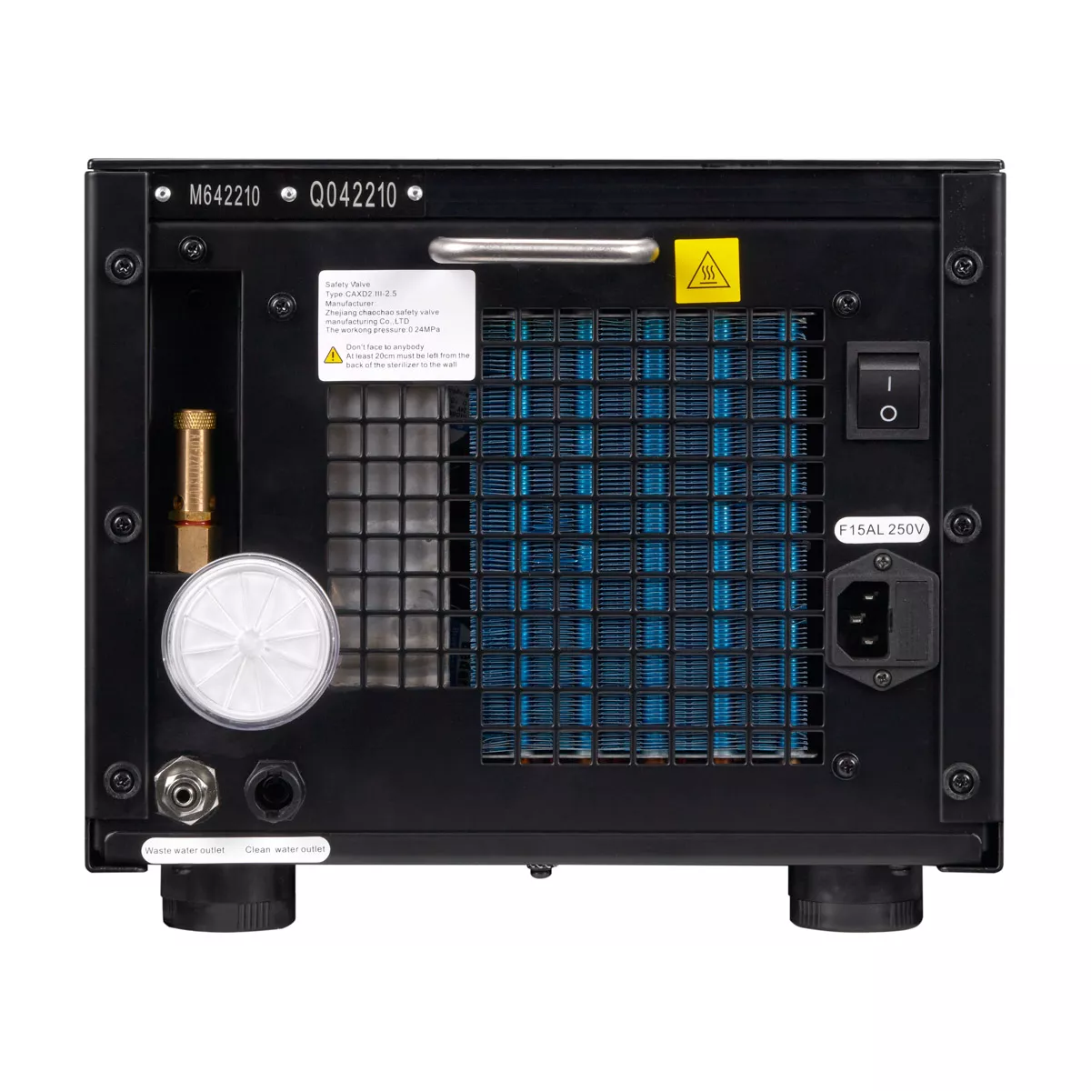 Urządzenie posiada wbudowany zbiornik na czystą (destylowaną) wodę, która służy do sterylizacji, z możliwością odpływu brudnej wody z tyłu urządzenia. System autodiagnozy skutecznie uchroni przez uszkodzeniem i pozwala zachować trwałość urządzenia. Autoklaw spełnia wszelkie wymogi sanepidu, a po zakupie tego modelu nie ma konieczności zgłaszania tego w Urzędzie Dozoru Technicznego.