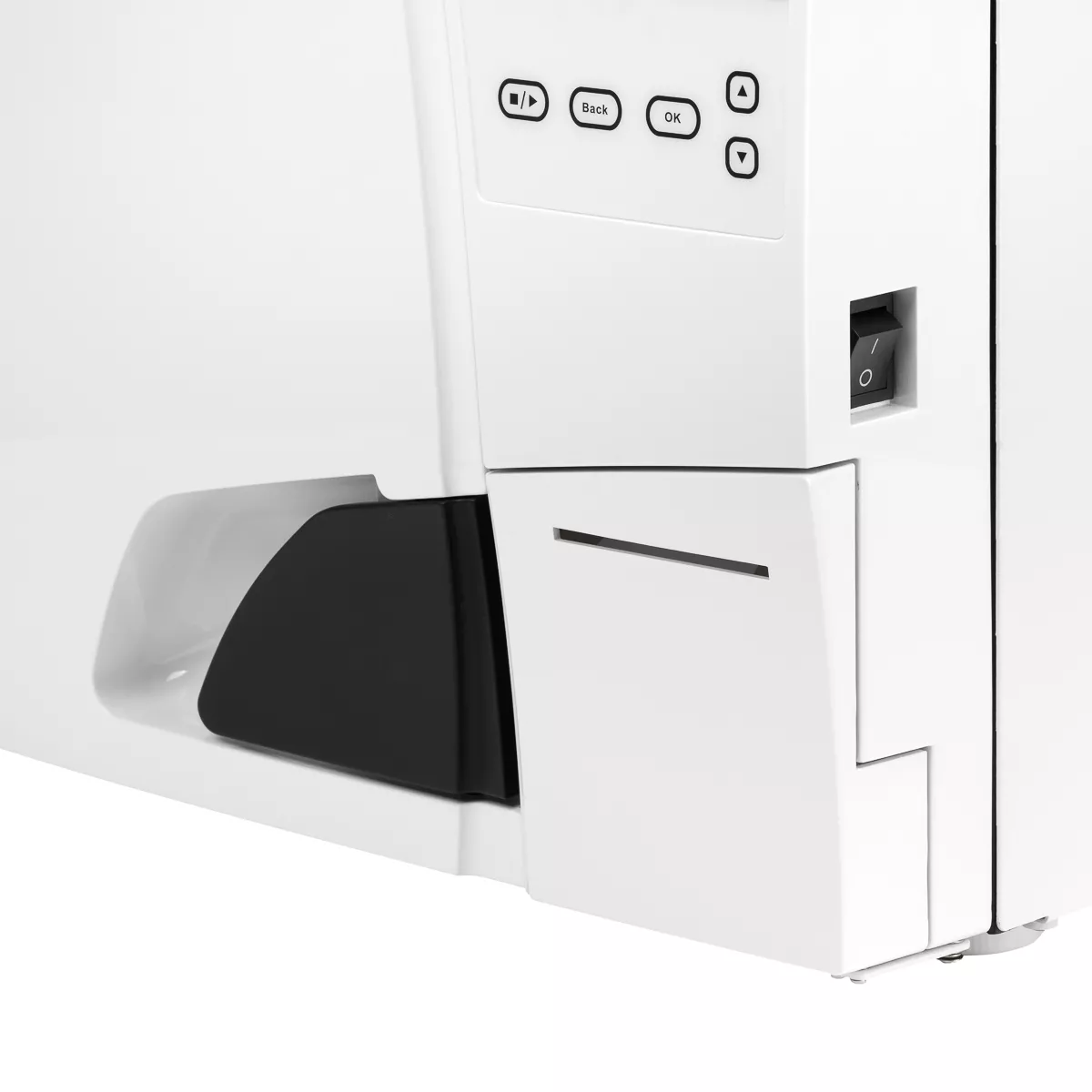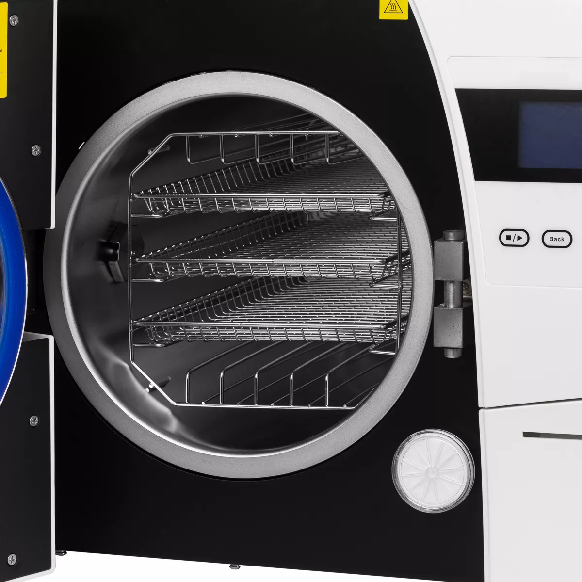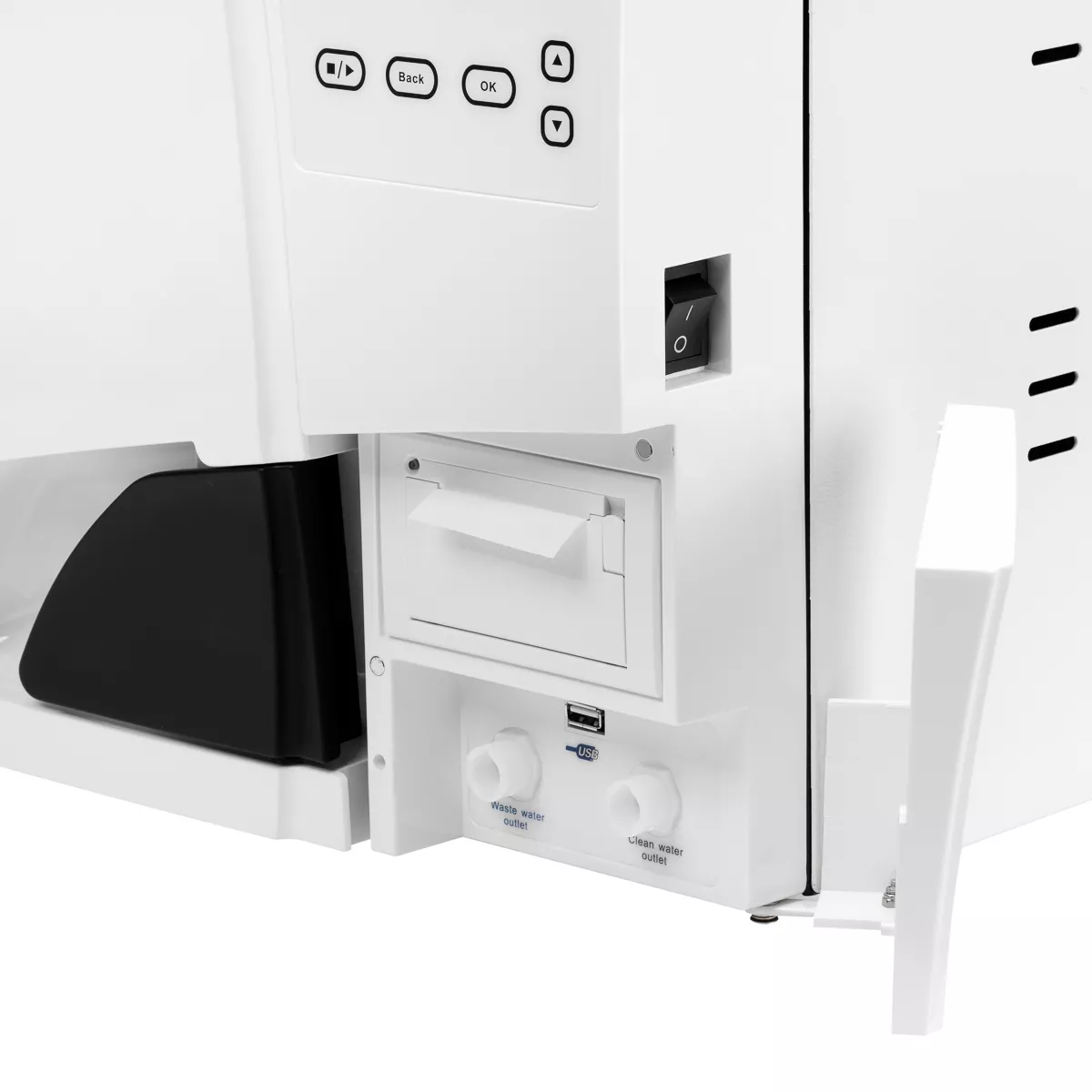 | Wbudowane zbiorniki na czystą i zużytą wodę | Zbiornik na czystą wodę jest przeznaczony na destylowaną lub dejonizowaną wodę, która posłuży do sterylizacji. Obecność zbiornika na zużytą wodę sprawia, że nie potrzebujemy pamiętać o zewnętrznym pojemniku. |