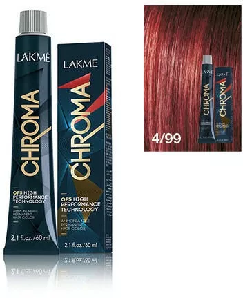 Odkryj moc profesjonalnej koloryzacji z Lakmé Chroma, farbą do włosów o łagodnej formule. Odcień 4/99 w tubce 60 ml to gwarancja intensywnego koloru i blasku, który utrzyma się na Twoich włosach na dłużej. Idealna dla tych, którzy pragną nie tylko pięknego koloru, ale także zdrowych i miękkich włosów.
