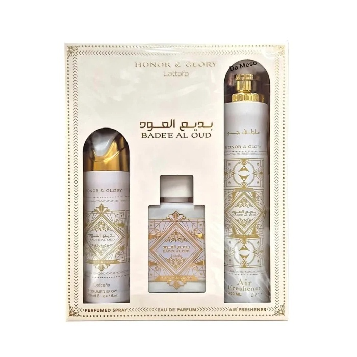 Zestaw Lattafa Bade'e Al Oud Honor & Glory to doskonałe rozwiązanie dla każdego, kto pragnie otaczać się luksusowym zapachem przez cały dzień. Wybierz ten elegancki zestaw dla siebie lub na prezent i poczuj prawdziwą moc orientu w codziennym życiu!