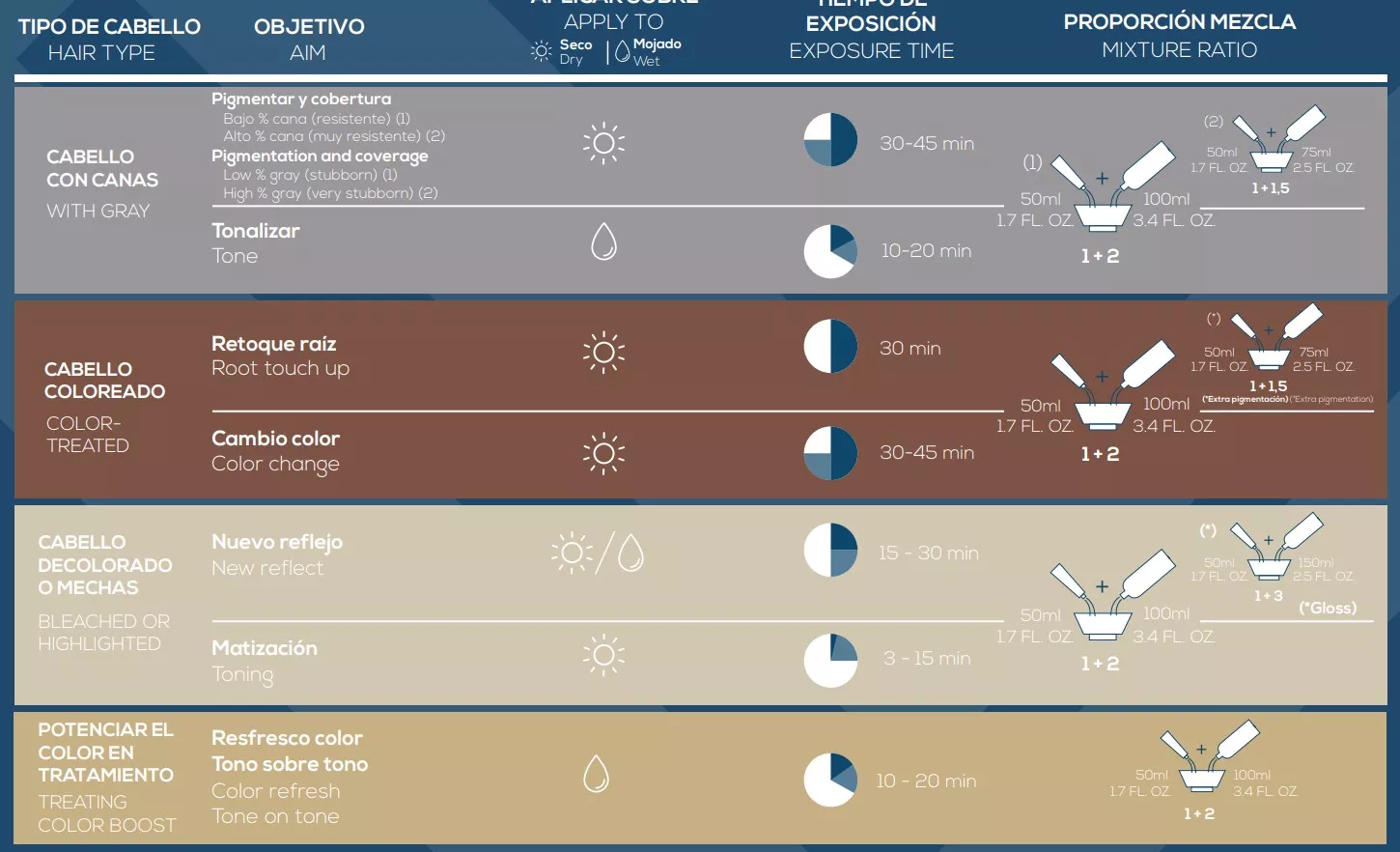 Nakładaj farbę na suche lub wilgotne włosy, w zależności od wybranej techniki i oczekiwanego efektu. Zalecane proporcje mieszania to 1+2 lub 1+3 z oksydantem. Farba cechuje się wysokim skoncentrowaniem pigmentu, dlatego proporcje należy dostosować do kondycji włosów oraz pożądanego rezultatu. Nawet po zmieszaniu z większą ilością oksydantu produkt pozostaje gęsty, co ułatwia aplikację i zapewnia komfort pracy.