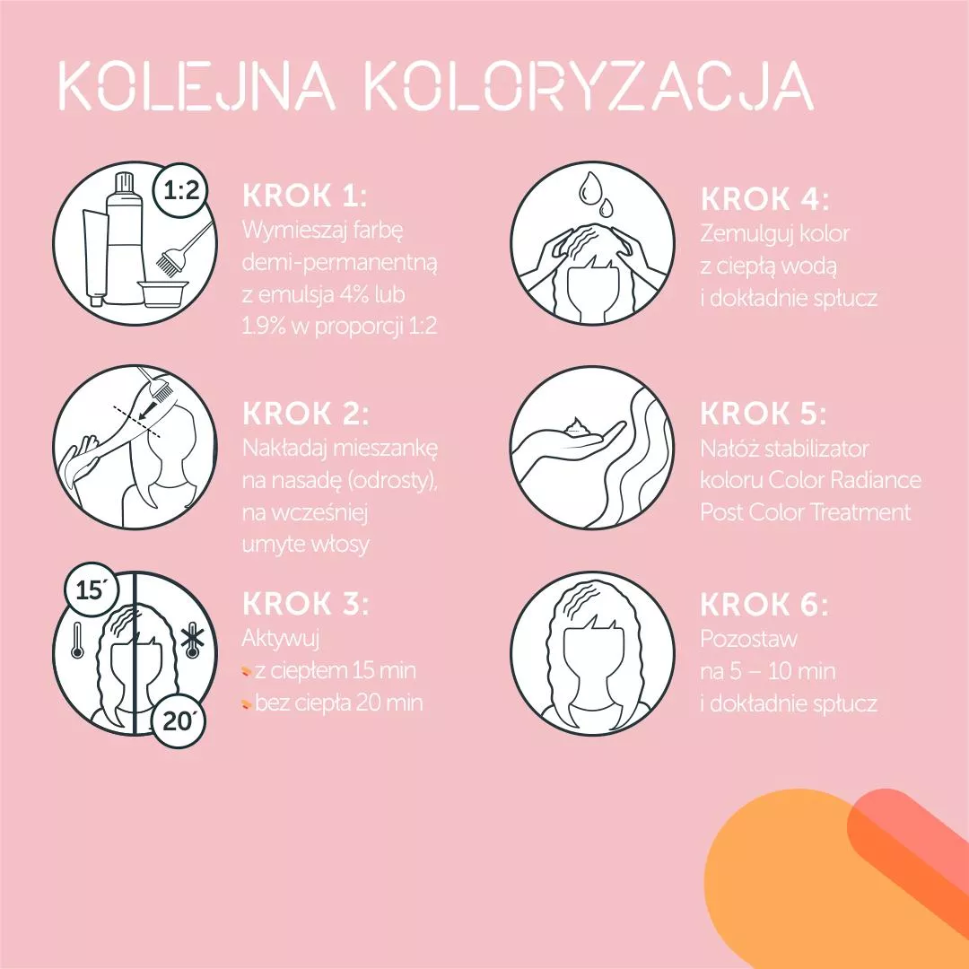 - Po farbowaniu, włosy możesz zemulgować - przeczesz produkt na środki i końce i pozostaw na 5 min (bez użycia ciepła).