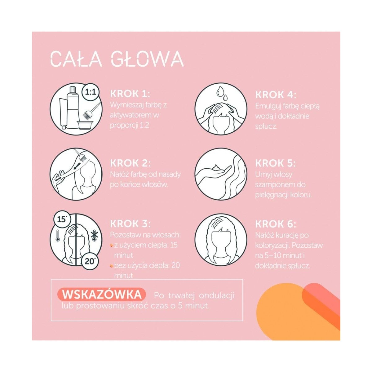 Wskazówka: w celu uzyskania intensywniejszych efektów kolorystycznych, można stosować na włosach wysuszonych. Bezpośrednio po trwałej ondulacji lub prostowaniu chemicznym zmniejszyć czas działania mieszanki o 5 min.