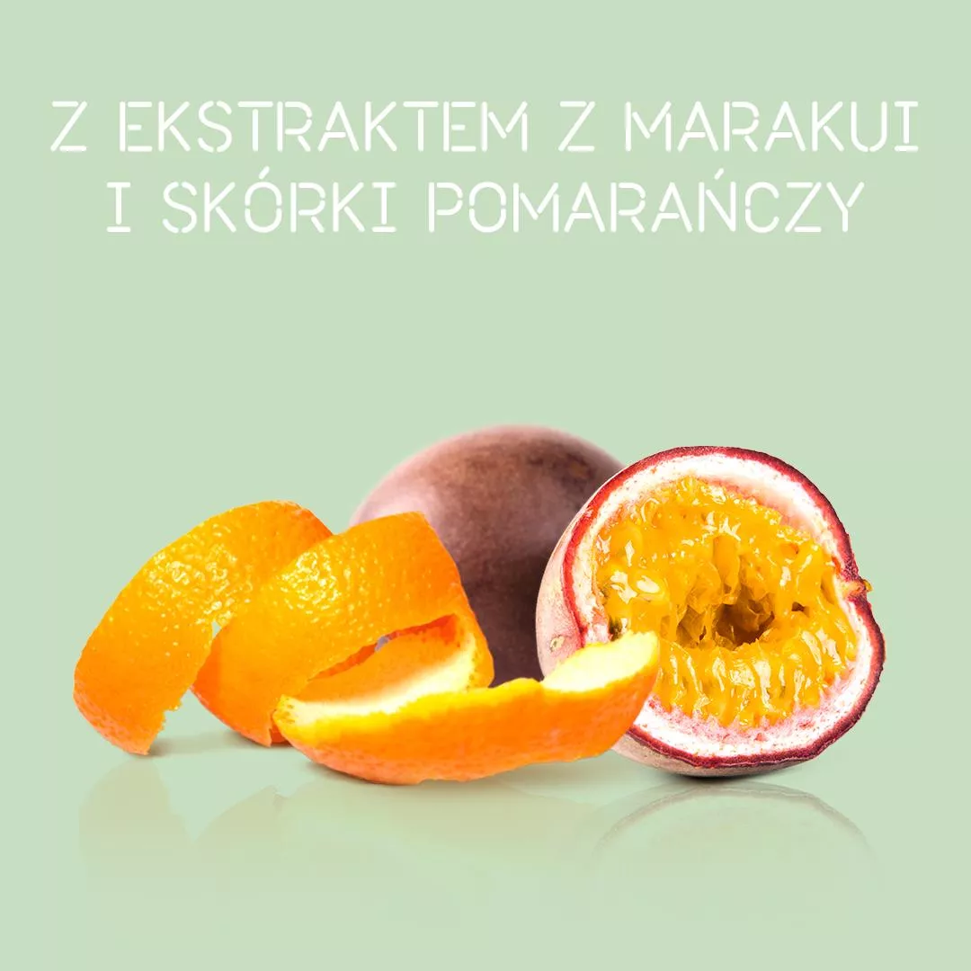 - Wzbogacona o ekstrakt z marakui i lipidy ze skórki pomarańczy, które wzmacniają włosy od wewnątrz i nadają im zdrowego blasku.