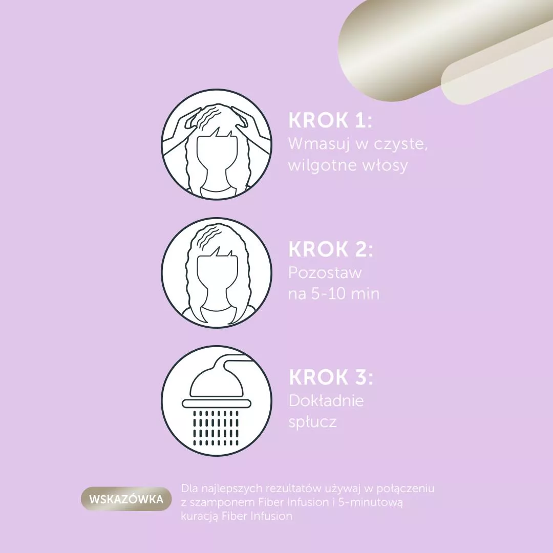 - Umyj włosy odbudowującym szamponem (najlepiej tym z linii Fiber Infusion od Londa Professional) i dokładnie je spłucz. Nałóż niewielką ilość maski na całą długość odsączonych z nadmiaru wody włosów.