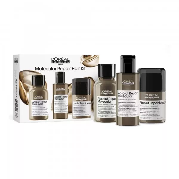 Profesjonalne serum do spłukiwania, skoncentrowane z 2% wiązaniami peptydowymi + 5 aminokwasami w celu naprawy struktury molekularnej włosów. To więcej niż naprawa powierzchni, wzmacnia wnętrze włosa na poziomie molekularnym. Profesjonalny szampon wzmacniający włosy Loreal Absolut Repair Molecular. Jego moc tkwi w zawartości wiązań peptydowych oraz aż 5 aminokwasów, które są w stanie naprawić strukturę makromolekularną włosów. Profesjonalna maska bez spłukiwania zawierająca wiązania peptydowe i 5 aminokwasów, które naprawiają strukturę makromolekularną włosów. Lekka formuła natychmiast wnika we włosy i przywraca im siłę.