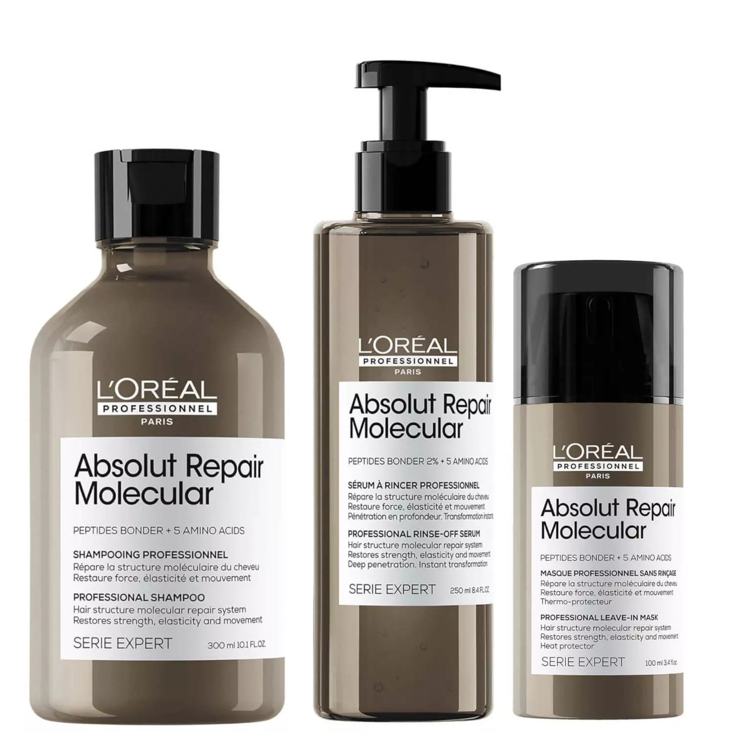 Gama Absolut Repair Molecular to przełomowa, 3-stopniowa pielęgnacja odbudowująca zniszczone włosy na poziomie molekularnym. Technologia odbudowy molekularnej włosów to zaawansowany system regeneracji, który działa na poziomie molekularnym, zwiększając siłę, elastyczność i ruch włosów. Ta technologia wykorzystuje 2% peptydów i 5 aminokwasów, aby uzupełnić strukturę molekularną włosów. Naukowo potwierdzona skuteczność.