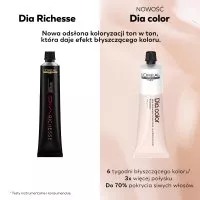 Poznaj nową, ulepszoną koloryzację ton w ton Loreal Dia Color. Jest to zupełnie nowa formuła: nabłyszczająca koloryzacja z kwasem hialuronowym, zapewniająca efekt odwrócenia utraty melaniny dla 6 tygodni błyszczącego koloru. Technologia Melanin Gap Filler uzupełnia ubytki po utraconej melaninie we włóknie włosa. Formuła zawiera składniki aż do 92% pochodzenia naturalnego.** Bez amoniaku.