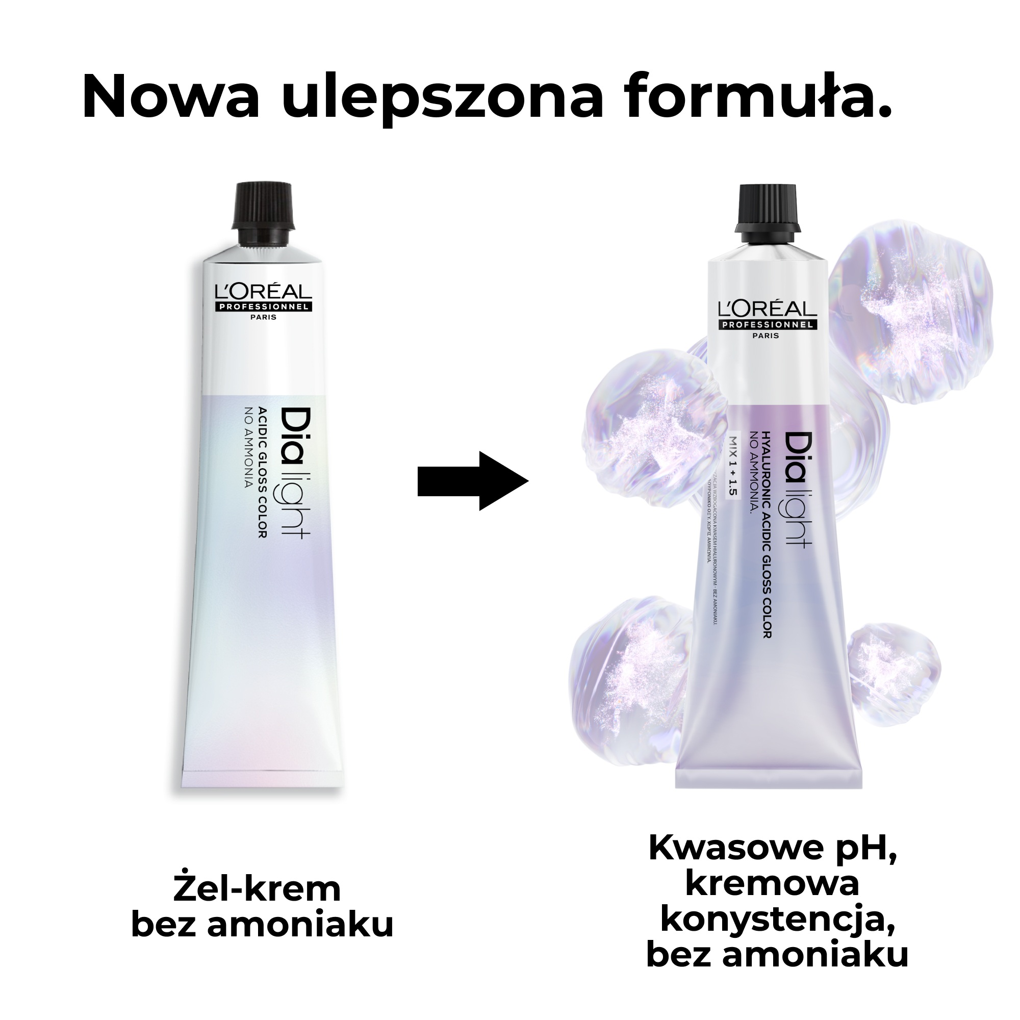 3. W misce, dedykowanym aplikatorze lub shakerze: Wymieszaj 60 ml (1 tubka) kremu koloryzującego Dia light. Następnie dodaj 90 ml Aktywatora Dia o stężeniu 1,8% (6 vol.) lub 2,7% (9 vol.), w zależności od pożądanych rezultatów. Ilości produktów mogą zostać zmienione (jeśli zachodzi taka potrzeba), zawsze utrzymując proporcję mieszanki 1:1.5.