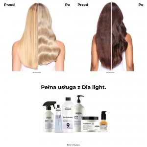 PRZYGOTOWANIE. -Załóż odpowiednie rękawiczki jednorazowe. -Stosuj wyłącznie z rekomendowanymi Aktywatorami Dia 1,8% (6 vol.) i 2,7% (9 vol.). - Używaj wyłącznie we wskazanych proporcjach 1:1.5. - W przypadku korzystania z shakera należy go otworzyć natychmiast po wymieszaniu, aby uniknąć jego pęknięcia i wylania się produktu. W misce, dedykowanym aplikatorze lub shakerze: - Wymieszaj 60 ml (1 tubka) kremu koloryzującego Dia light. - Następnie dodaj 90 ml Aktywatora Dia o stężeniu 1,8% (6 vol.) lub 2,7% (9 vol.), w zależności od pożądanych rezultatów. Ilości produktów mogą zostać zmienione (jeśli zachodzi taka potrzeba), zawsze utrzymując proporcję mieszanki 1:1.5. APLIKACJA I SPŁUKIWANIE. - Załóż odpowiednie rękawiczki jednorazowe. - Nie używaj metalowych narzędzi (spinek, grzebieni itp.). - Dokładnie spłucz włosy po upływie czasu trzymania. Aplikacja: Nałóż mieszankę na suche lub mokre włosy za pomocą aplikatora lub pędzla. - Czas trzymania: do 20 minut. - Delikatnie zemulguj, dokładnie spłucz i umyj włosy szamponem Metal Detox.