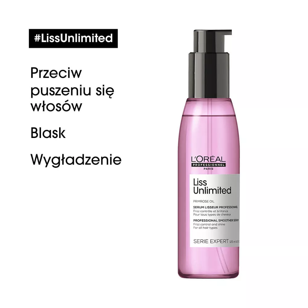 Cierpisz z powodu matowych, nieposłusznych włosów? Marzysz o gładkich, lśniących pasmach? Wypróbuj olejek nadający blask włosom niezdyscyplinowanym Loreal Liss Unlimited, który dzięki wyciągom z wiesiołka i kompleksowi prokeratynowemu pielegnuje włosy i zapewnia efekt wygładzenia. Olejek wygładzający to rewelacyjny produkt dedykowany włosom trudnym do ujarzmienia, skłonnym do puszenia oraz matowym. Dodaje blasku, dyscyplinuje odstające kosmyki i sprawia, że włosy są w idealnym ładzie, a do tego lśnią zdrowym blaskiem. Może być stosowany w ciągu dnia do poprawiania fryzury, a także do suchych końców włosów.