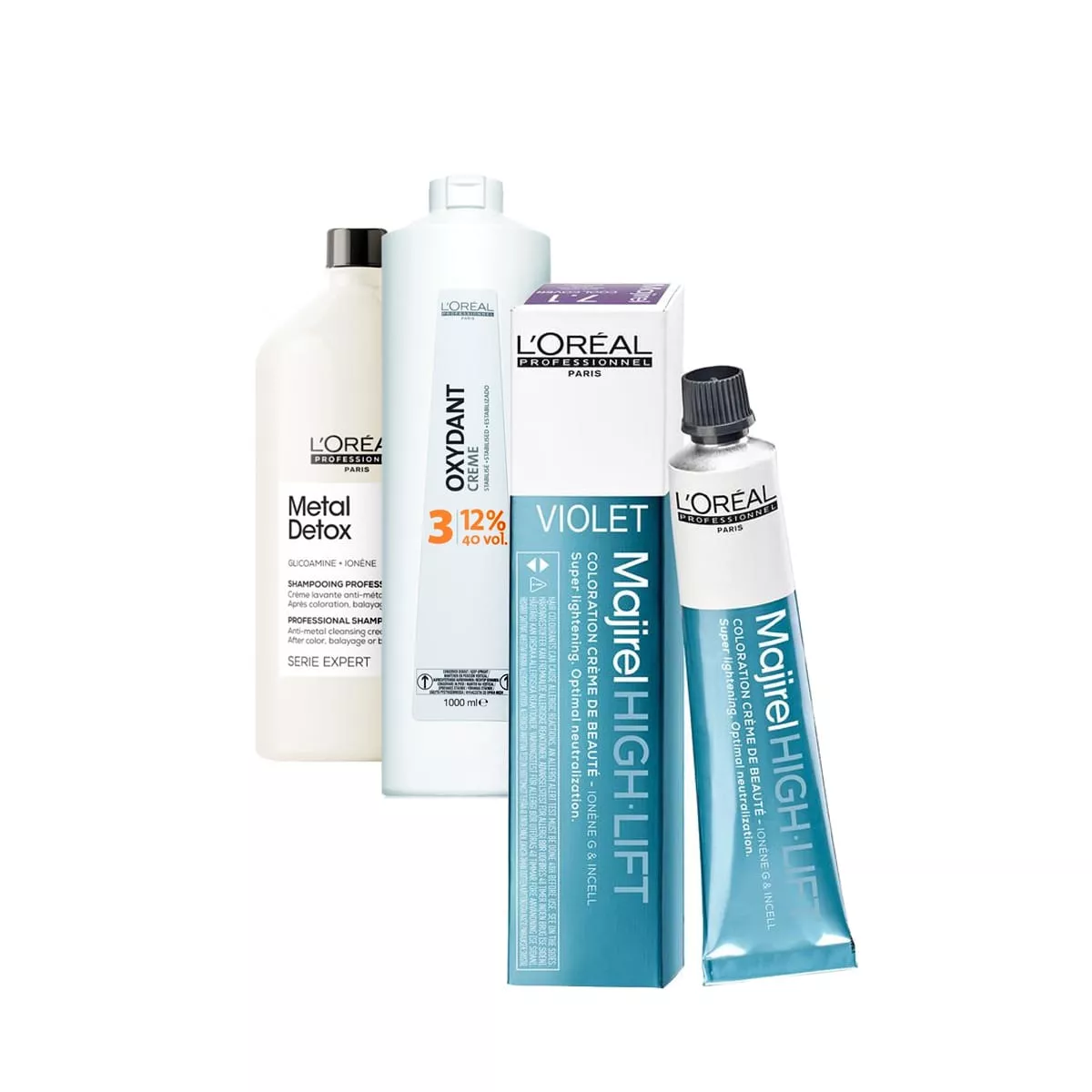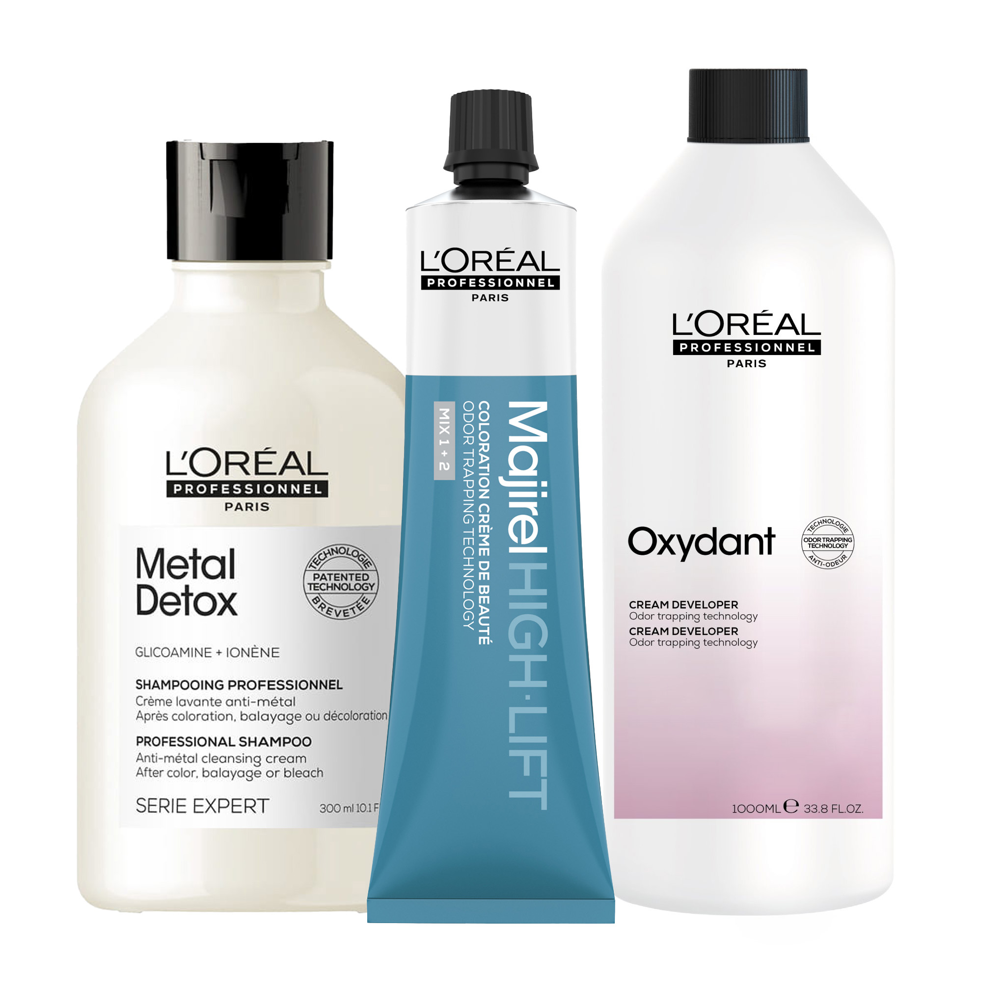 Używaj wyłącznie z oksydantami L'Oréal Professionnel. Majirel High Lift stosuj się w proporcji 1 + 2. Jedną tubkę 60 ml należy wymieszać ze 120 ml oksydantu kremowego L’Oréal Professionnel 30 vol. (9%), aby uzyskać rozjaśnienie do 3 tonów. Aby uzyskać rozjaśnienie do 4,5 tonu, wybierz oksydant L’Oréal Professionnel 40 vol. (12%). Czas trzymania: do 50 minut. Uwaga: czas trzymania liczony jest od zakończenia aplikacji mieszanki na odrost. Po upływie czasu trzymania, delikatnie emulguj włosy przez kilka minut. Dokładnie spłucz włosy, aż woda będzie czysta. Zakończ koloryzację szamponem ochronnym Metal Detox.